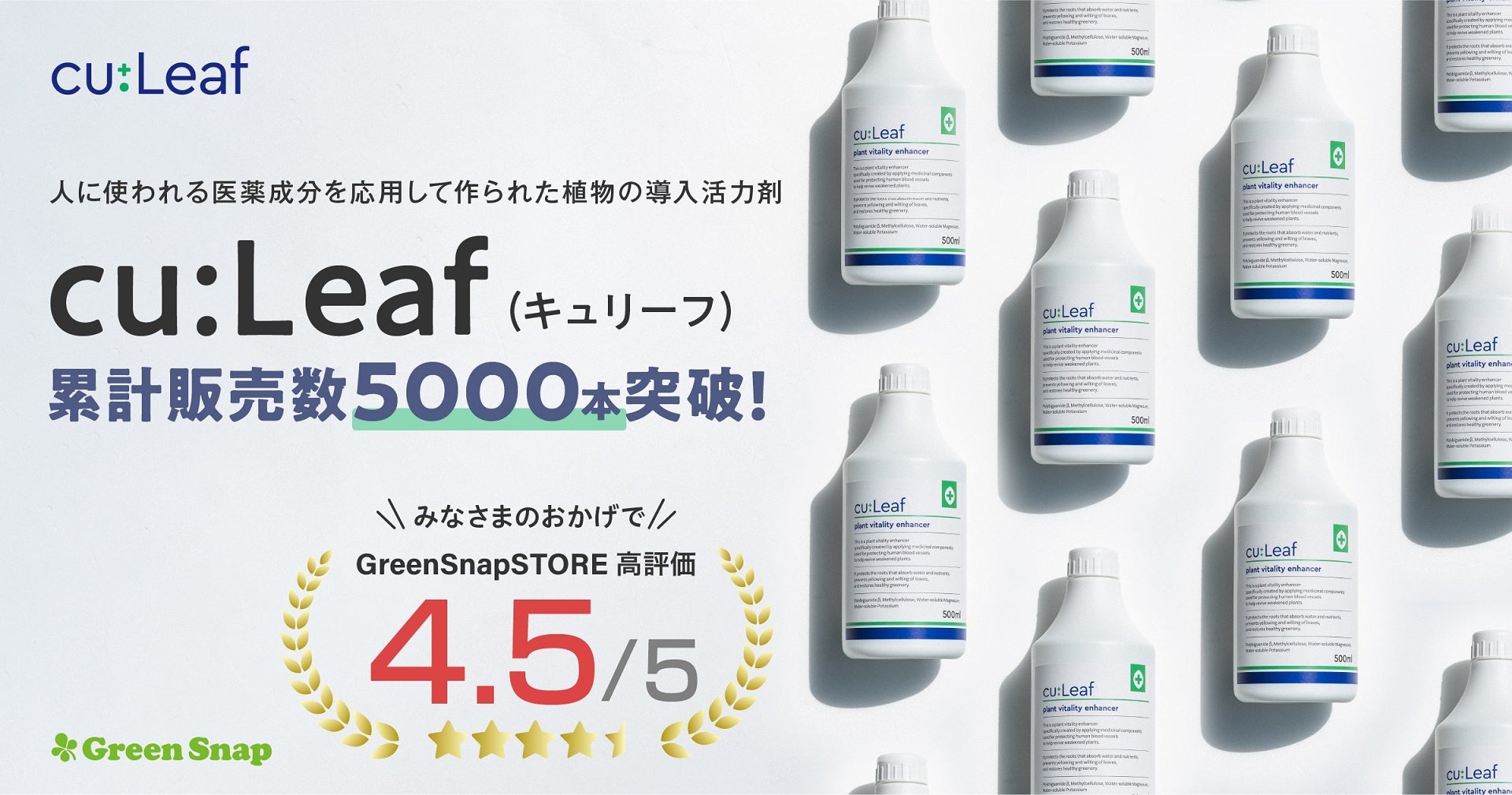 植物コミュニティアプリ「GreenSnap」を運営するGreenSnap株式会社(本社:東京都中央区、代表取締役:西田貴一)は、2024年7月に発売した、人に使われる医薬成分を応用したオリジナル植物専用活力剤「cu:Leaf(キュリーフ)」が、累計販売本数5,000本を突破したことをお知らせいたします。