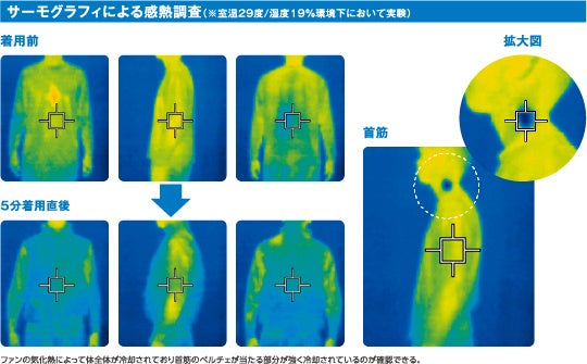 室温29度・湿度19%以下にて「マッスルスーツCOOL VEST」着用実験を行ったところ、ファンの気化熱によって体全体が冷却されており、首筋のペルチェが当たる部分が強く冷却されているのが確認できました。