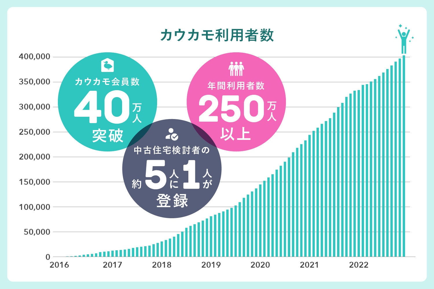 中古・リノベーション住宅の流通プラットフォーム「カウカモ」は、登録会員数が昨年12月に40万人を突破し、会員登録をせずに情報を閲覧している方を含めると、利用者数は年間250万人以上(2022年1月1日~2022年12月31日実績)です。