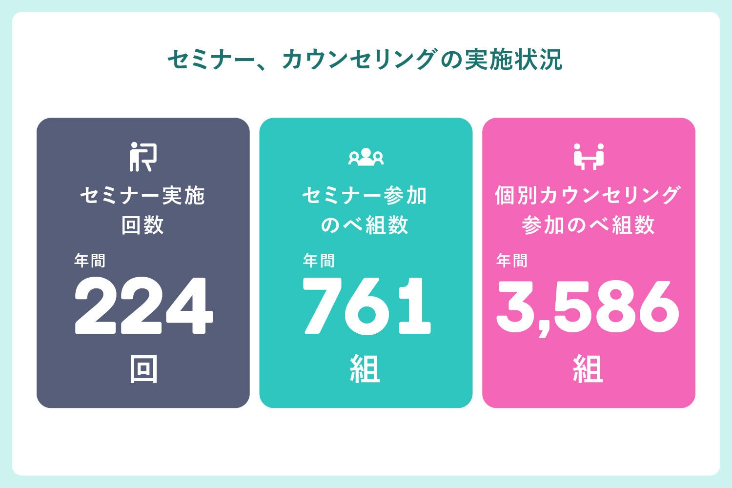カウカモでは、検討初期段階のお客さまに向け、この1年で年間224件のセミナーを実施し、のべ761組のお客さまにご参加いただきました。また、個別カウンセリングも年間3,586組のお客さまにご参加いただきました。(2022年6月~2023年5月実績)