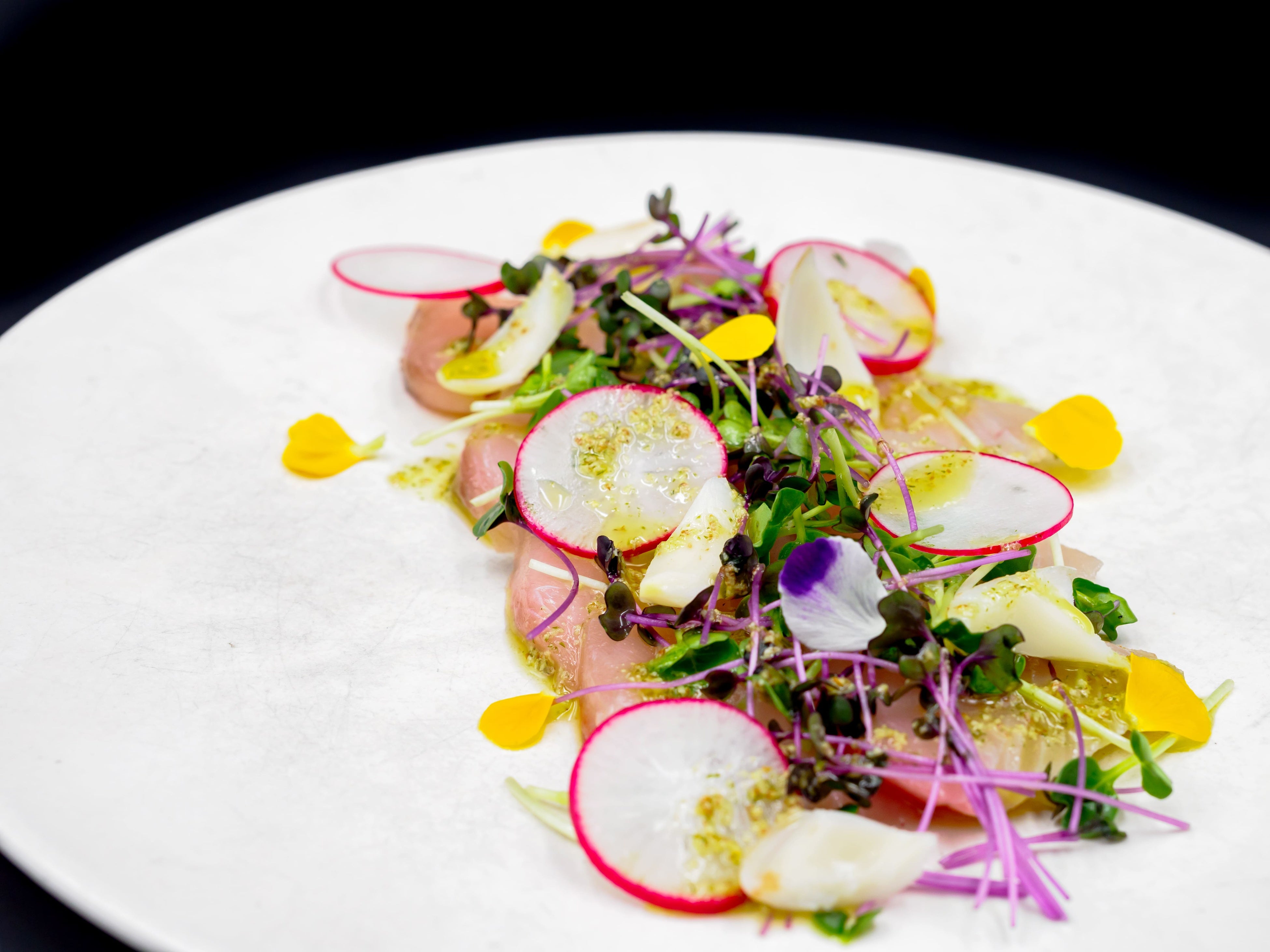 口当たりの柔らかいサワラとホクホクとした食感の百合根、シャキシャキ食感のかいわれやラディッシュ、様々な食感のコントラストもお楽しみください。