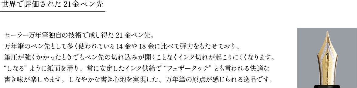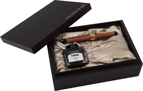 ペン先やボディは存在感、重量感のあるキングサイズを採用しており、蓋や胴の天然素材と相まって最上級の万年筆として高級感を演出しています。