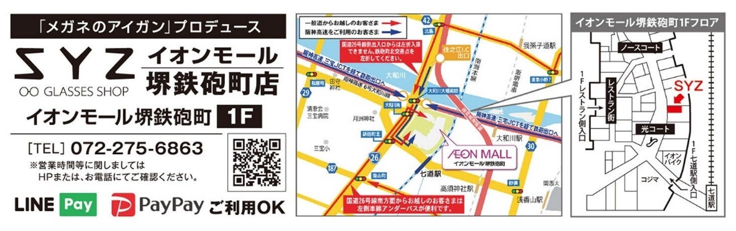 メガネ・補聴器を販売する「メガネの愛眼」「Aigan」 ( https://www.aigan.co.jp/ )を運営する愛眼株式会社(本社:大阪市天王寺区、代表取締役社長:下條 三千夫)は、2022年3月5日(土)に、大阪府堺市堺区鉄砲町のイオンモール堺鉄砲町1Fに「SYZ(シーズ)イオンモール堺鉄砲町店」をオープンいたします。