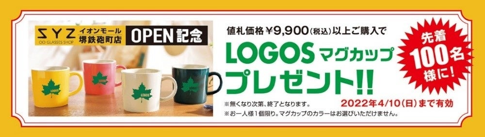 各コーナーには、商品の特徴が一目でわかるアイコンPOPを配置することで、ブランドをはじめ、メガネのデザインを選びながら商品の良さや、機能性を感じていただけます。OPEN記念企画として、2022年4月10日(日)までの期間、値札価格¥9,900(税込)以上のメガネをお買い上げで先着100名様に【LOGOSマグカップ】をプレゼント致します!