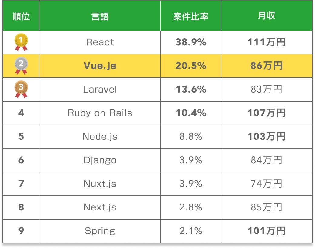 案件数ランキング2位はJavaScriptフレームワークのVue.js|フリーランス副業調査