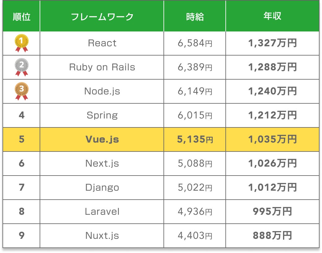 Vue.jsの市場価値は非常に高く、開発者にとって魅力的なキャリアパスを提供しています。先のデータによると、Vue.js開発者の平均年収は1,035万円で、プログラミング言語の年収ランキングで5位に位置しています。これは、Vue.jsスキルに対する高い需要と、それを持つ開発者の価値を反映しています。