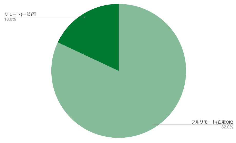 案件の84.21%がフルリモートとなっており、開発者が自宅やお気に入りの場所で仕事ができる柔軟性を提供しています。残りの15.79%もリモートが一部可能であり、これはオフィスでの作業と在宅勤務を組み合わせたハイブリッドな働き方を示唆しています。この高いリモート対応率は、場所の制約なく仕事ができる自由度の高さを示しており、ワークライフバランスの向上や多様な働き方を実現に寄与しています。