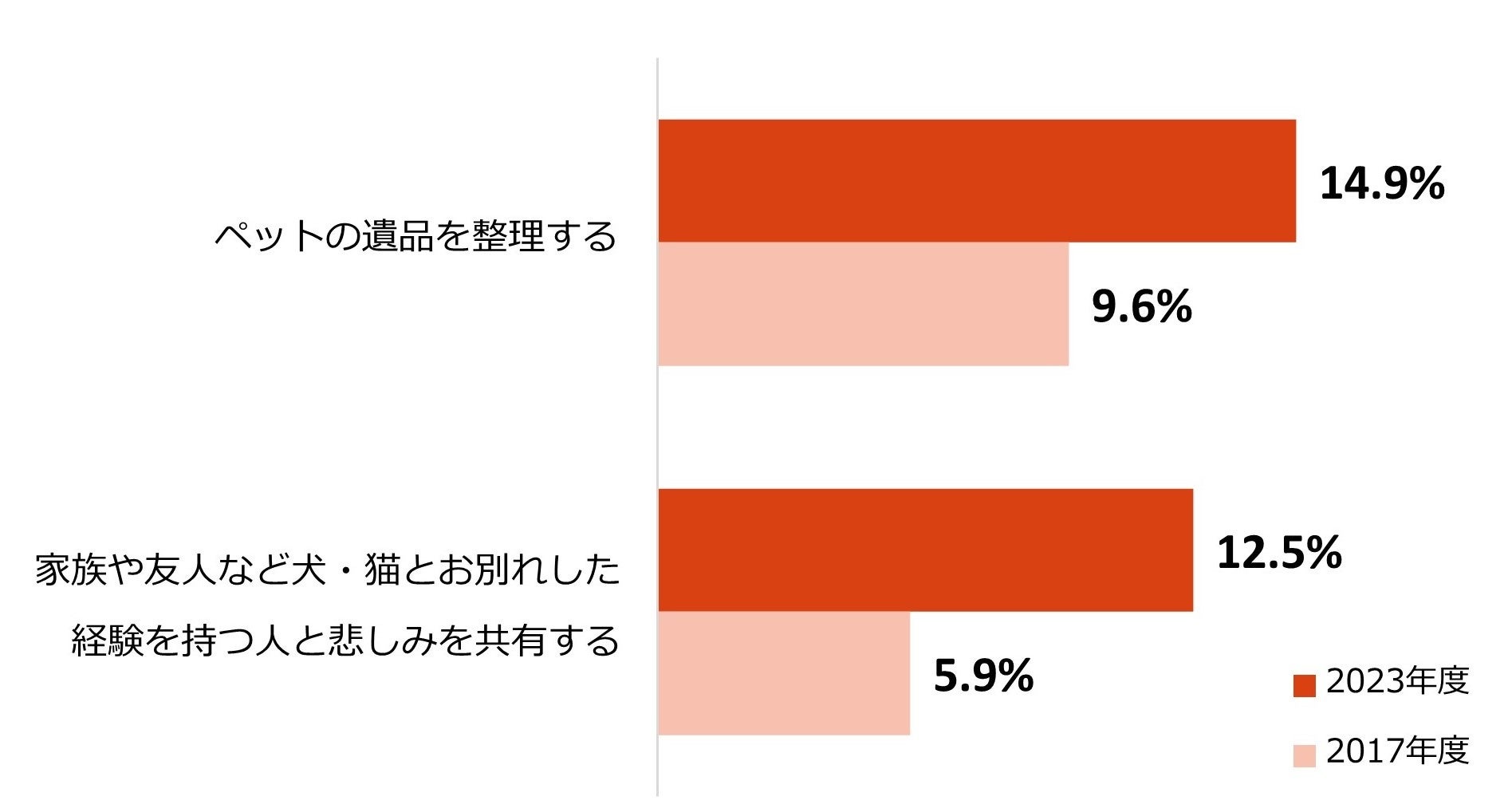 また、前回調査時と比べ増加したのは、「ペットの遺品を整理する」と「家族や友人など犬・猫とお別れした経験を持つ人と悲しみを共有する」でした。特に「家族や友人など犬・猫とお別れした経験を持つ人と悲しみを共有する」についてはほぼ倍増しており、家族や大切な人とペットが紡いだ「絆」がその経験を緩和することに貢献しているのかもしれません。