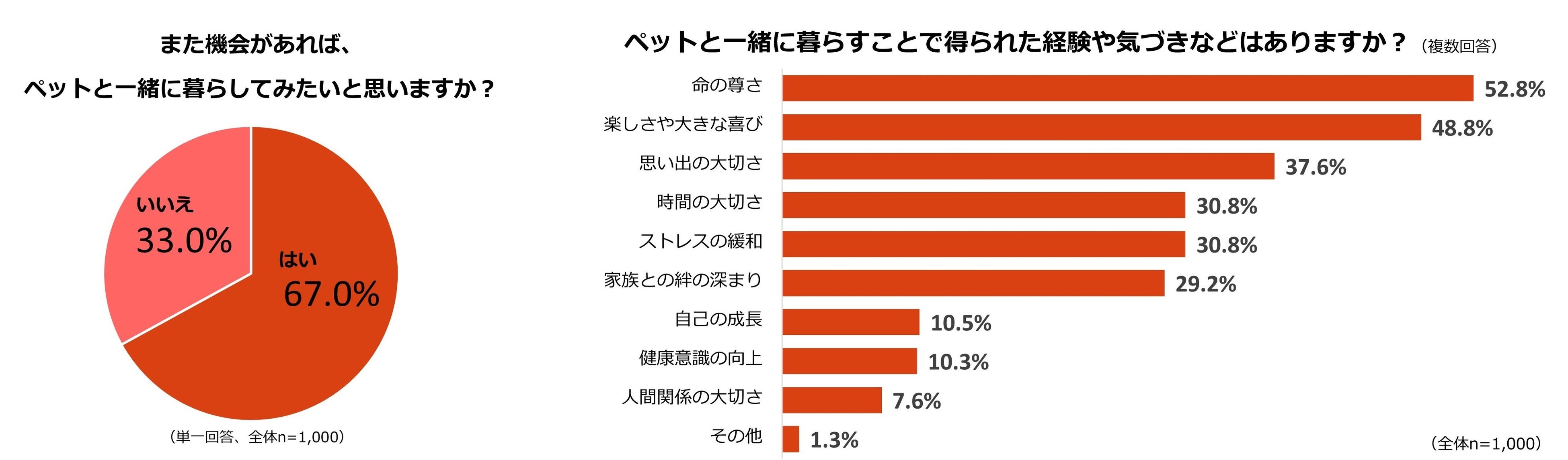 また、「機会があればペットと一緒に暮らしてみたいと思うか」との問いに対して、ペットを亡くす悲しみを知った方でも、約7割の方が「機会があればペットと一緒に暮らしてみたい」と回答しているところからも、ペットと過ごす時間の尊さを窺い知ることができます。