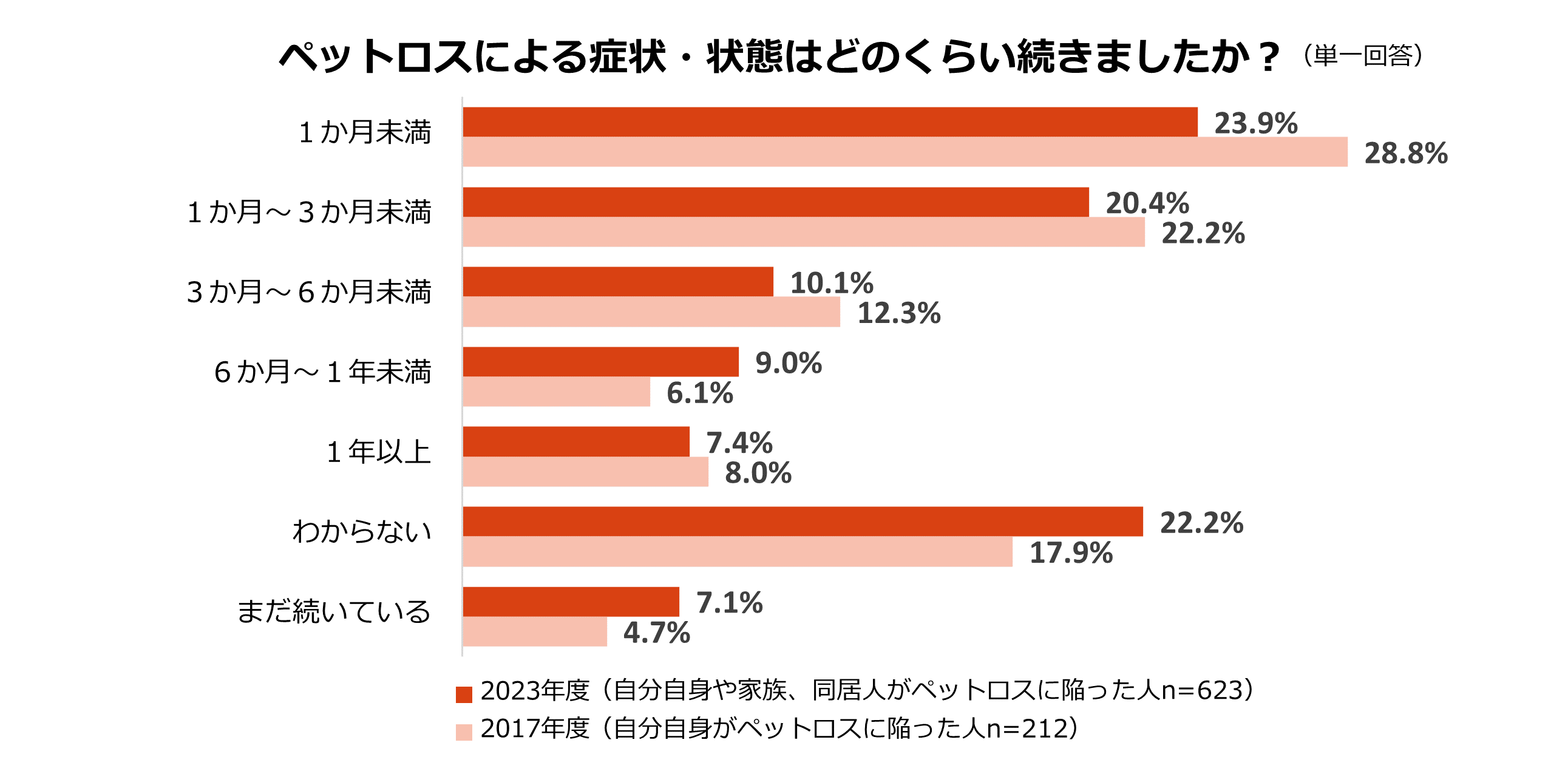 「ペットロス」の症状・状態がどのくらい続いたかを尋ねたところ、「1か月未満」を選択した方が23.9%と最も多くなりました。ペットを亡くした悲しみは癒えずとも、「ペットロス」の症状は落ち着いていくようです。一方で「わからない」を選択した方も2割にのぼり、ご自身でも気づかないくらいゆっくりと回復していき、気づいた時には回復していたという方もいらっしゃるのではないでしょうか。