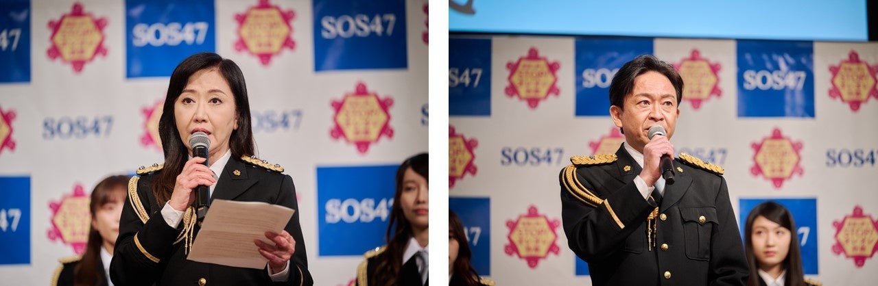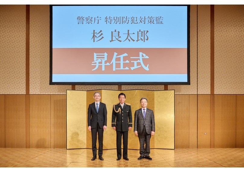 同日、杉良太郎特別防犯対策監の昇任式が執り行われ、杉対策監と、国家公安委員会委員長の谷公一氏、警察庁長官の露木康浩氏が出席しました。SOS47を牽引する功績から、特別防犯対策監の階級が星3つから4つへと昇格しました。