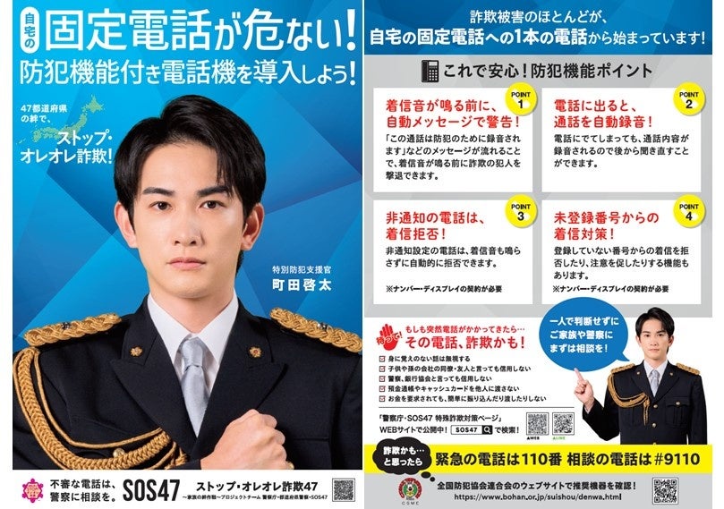 本イベント前には、メディアに向けて令和4年度制作のSOS47啓発用チラシと、47都道府県ご当地動画が公開されました。チラシには特別防犯支援官の町田啓太氏を起用し、多くの詐欺被害は自宅の固定電話からの電話という事を受けて、防犯機能付き電話の設置を促す内容となっています。