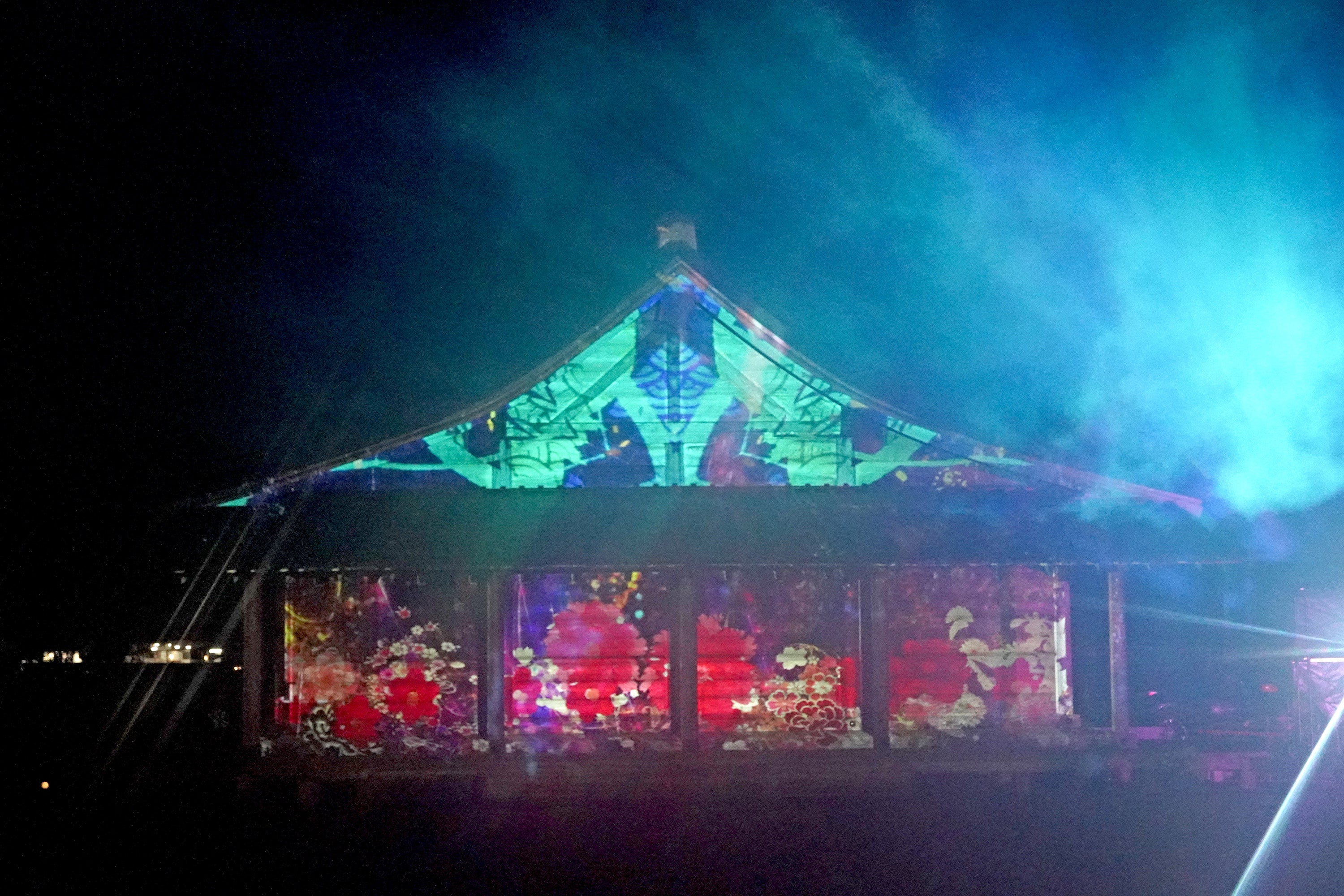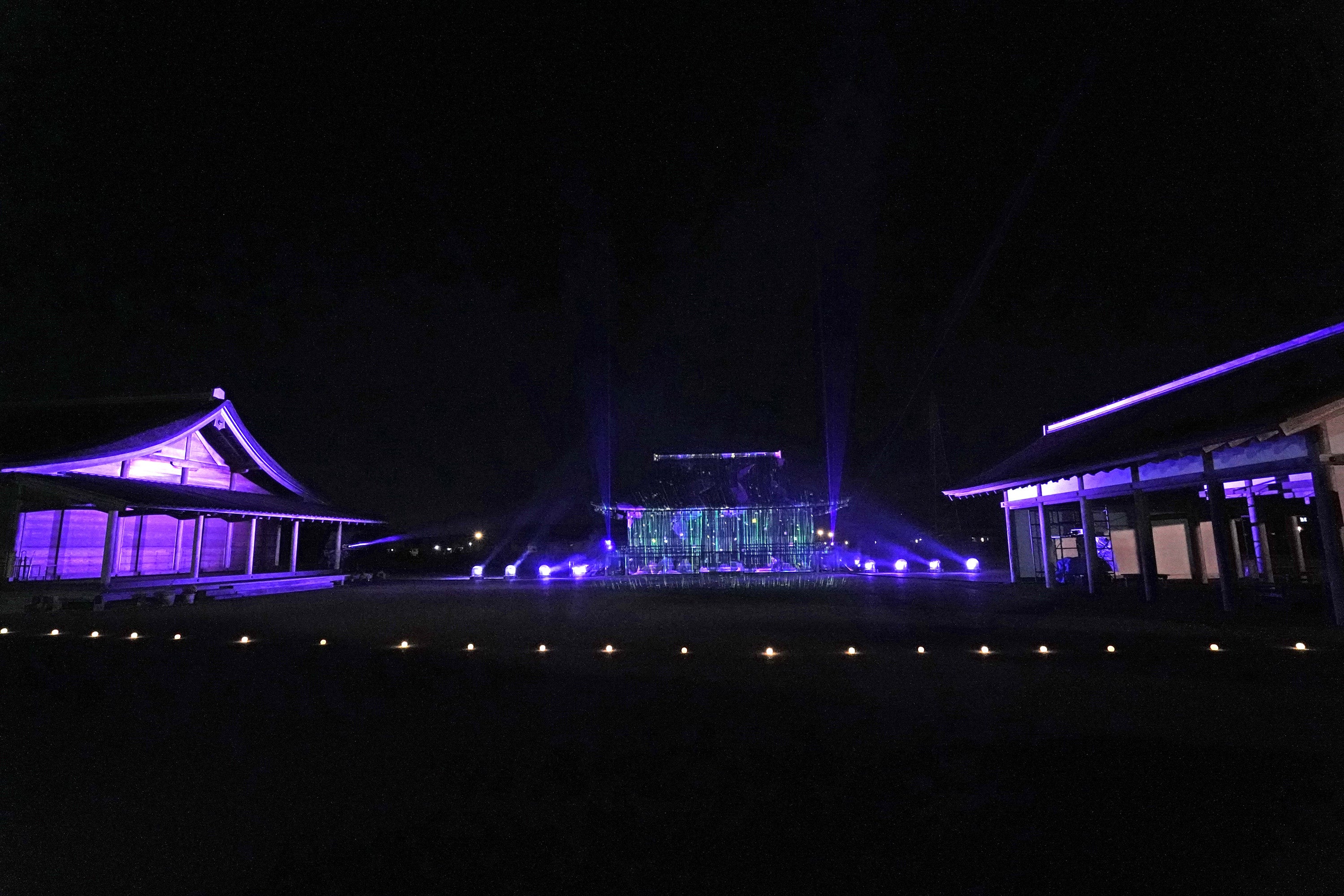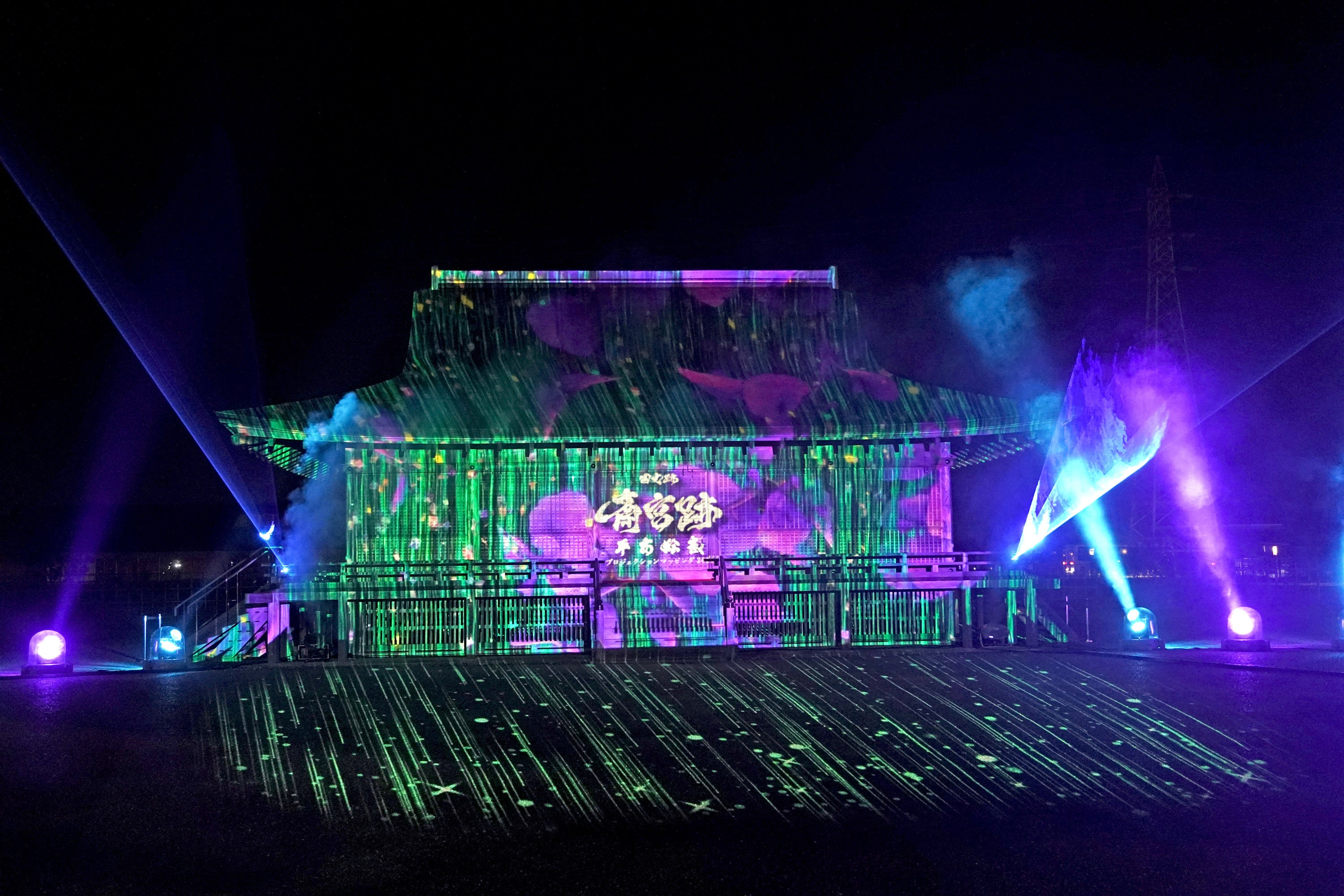 【内容】 かつて斎王が暮らした宮殿の遺跡、国史跡斎宮跡にある「さいくう平安の杜」の正殿・東脇殿・西脇殿に「斎王群行絵巻」「伊勢物語図屏風」「源氏物語絵巻」「十二単」など日本の文化芸術をモチーフとした絢爛豪華なデジタルアニメーションやきらびやかなデジタルアートなどのプロジェクションマッピング映像を投影しました。