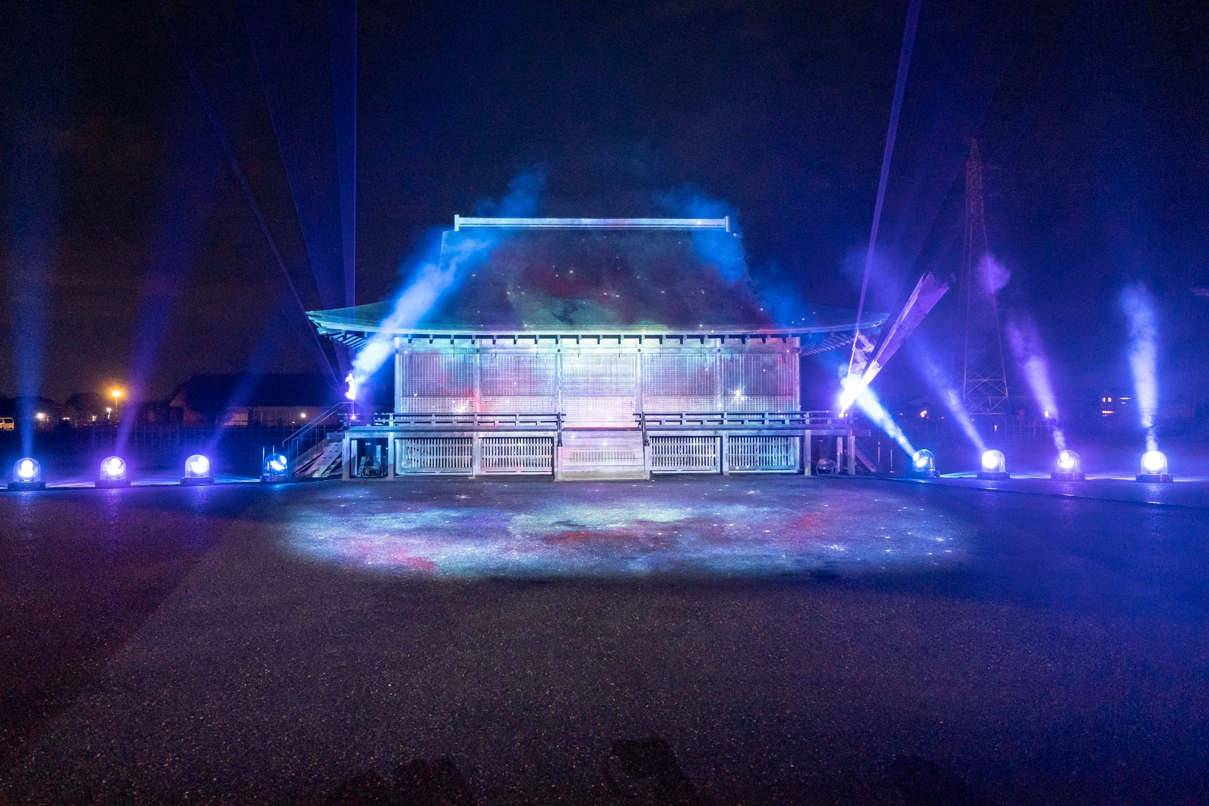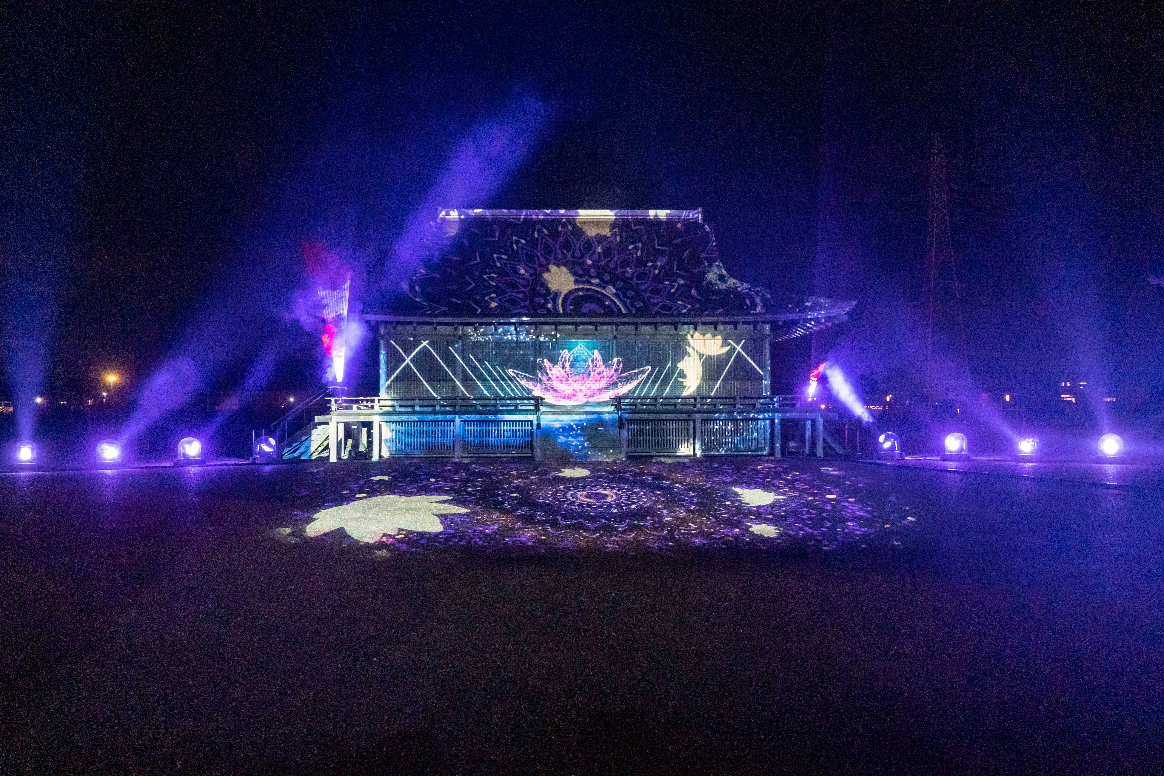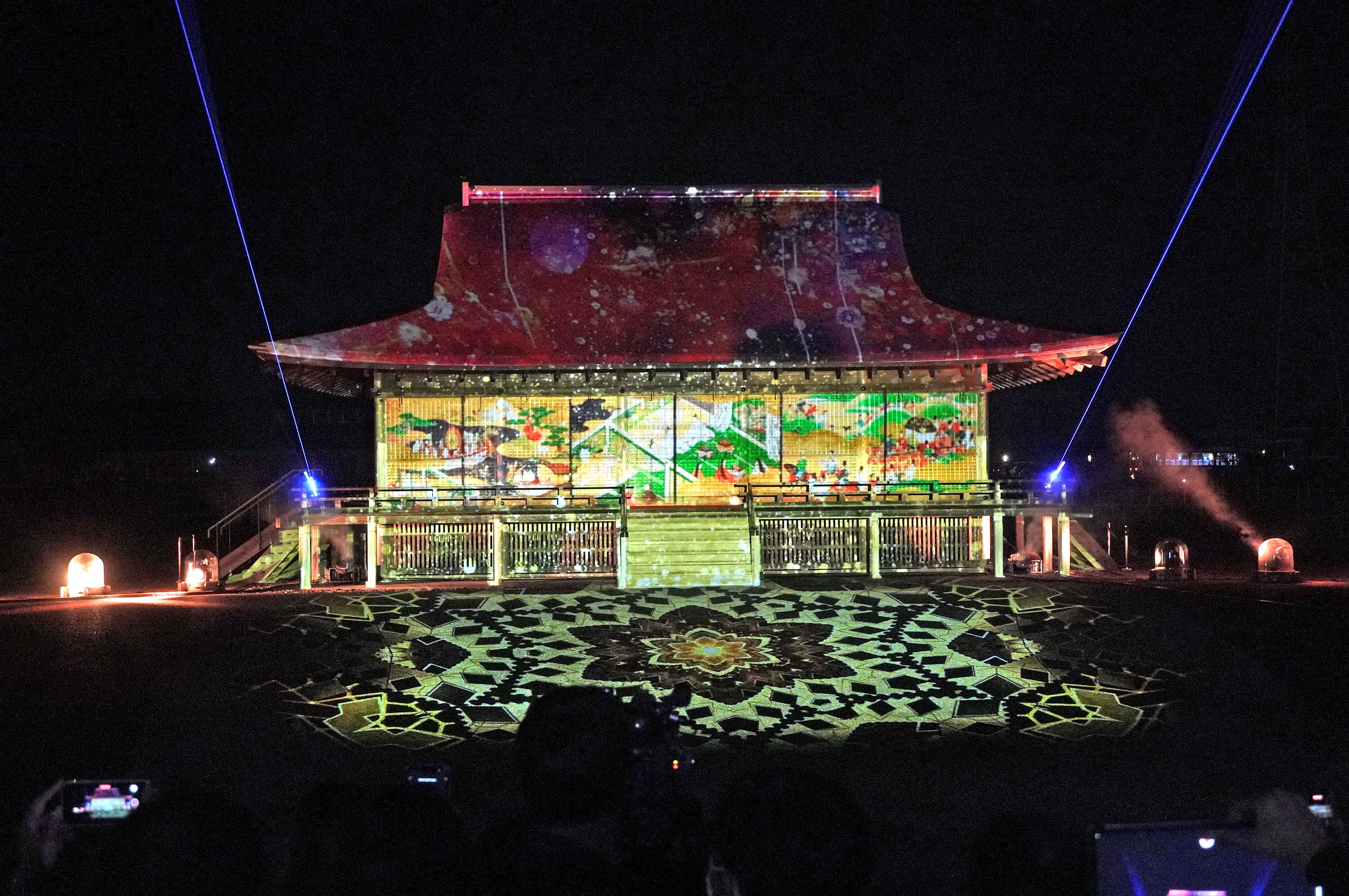 【内容】 かつて斎王が暮らした宮殿の遺跡、国史跡斎宮跡にある「さいくう平安の杜」の正殿・東脇殿・西脇殿に「斎王群行絵巻」「伊勢物語図屏風」「源氏物語絵巻」「十二単」など日本の文化芸術をモチーフとした絢爛豪華なデジタルアニメーションやきらびやかなデジタルアートなどのプロジェクションマッピング映像を投影しました。