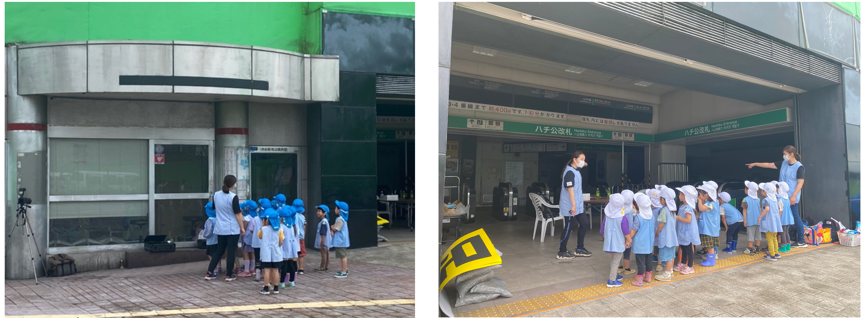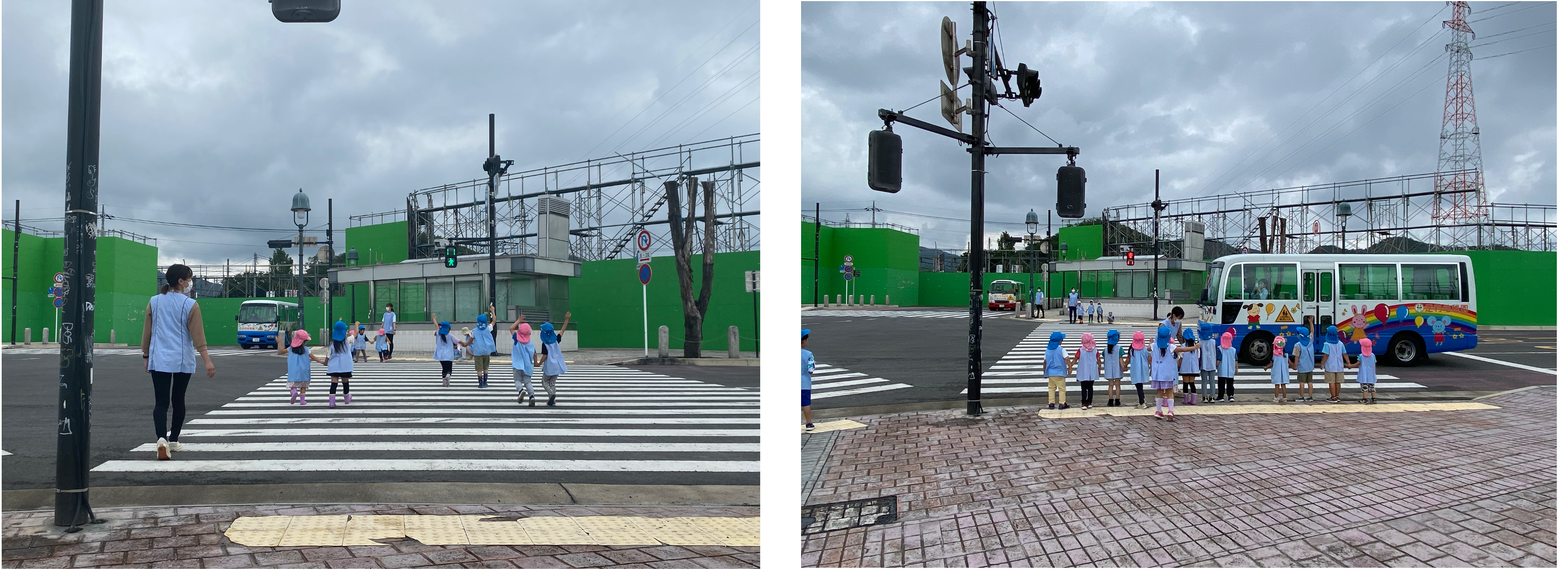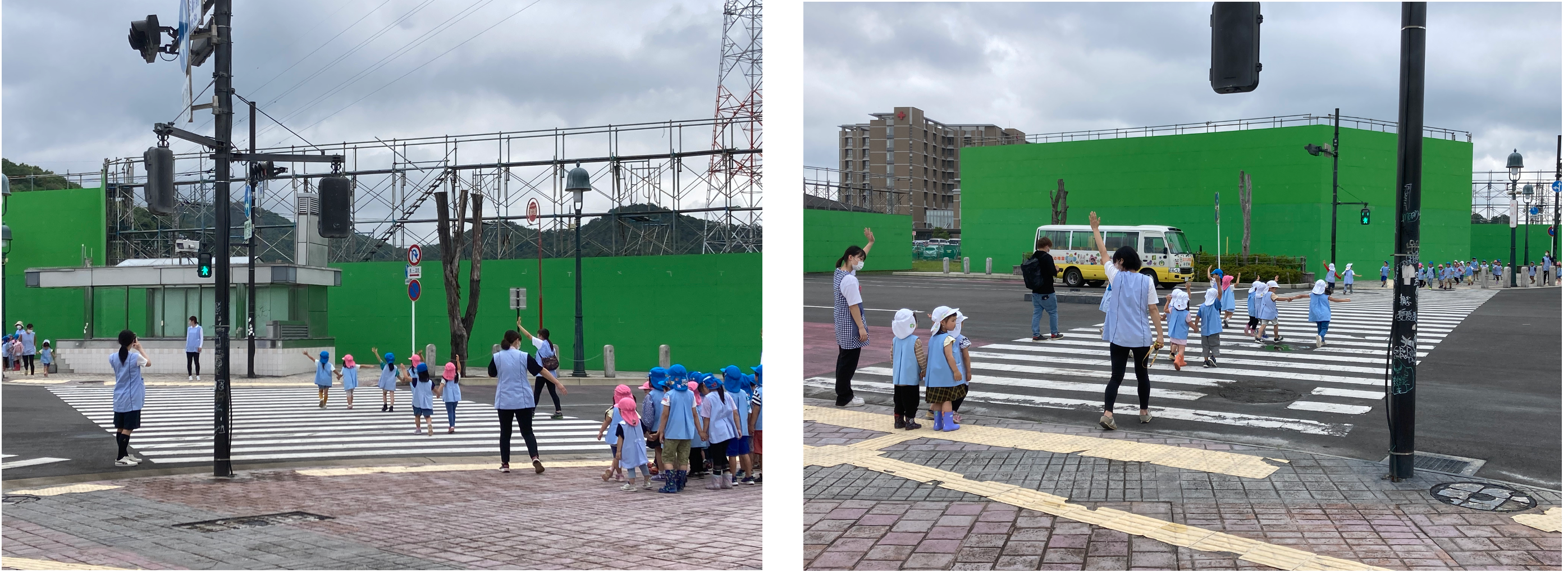 スタジオ内に幼稚園バスを乗り入れて、園児たちに信号機の意味や横断歩道の渡り方などを指導、横断の練習が行われました。安全教室終了後には、スタジオ内の見学、記念撮影が行われ大盛況のイベントとなりました。