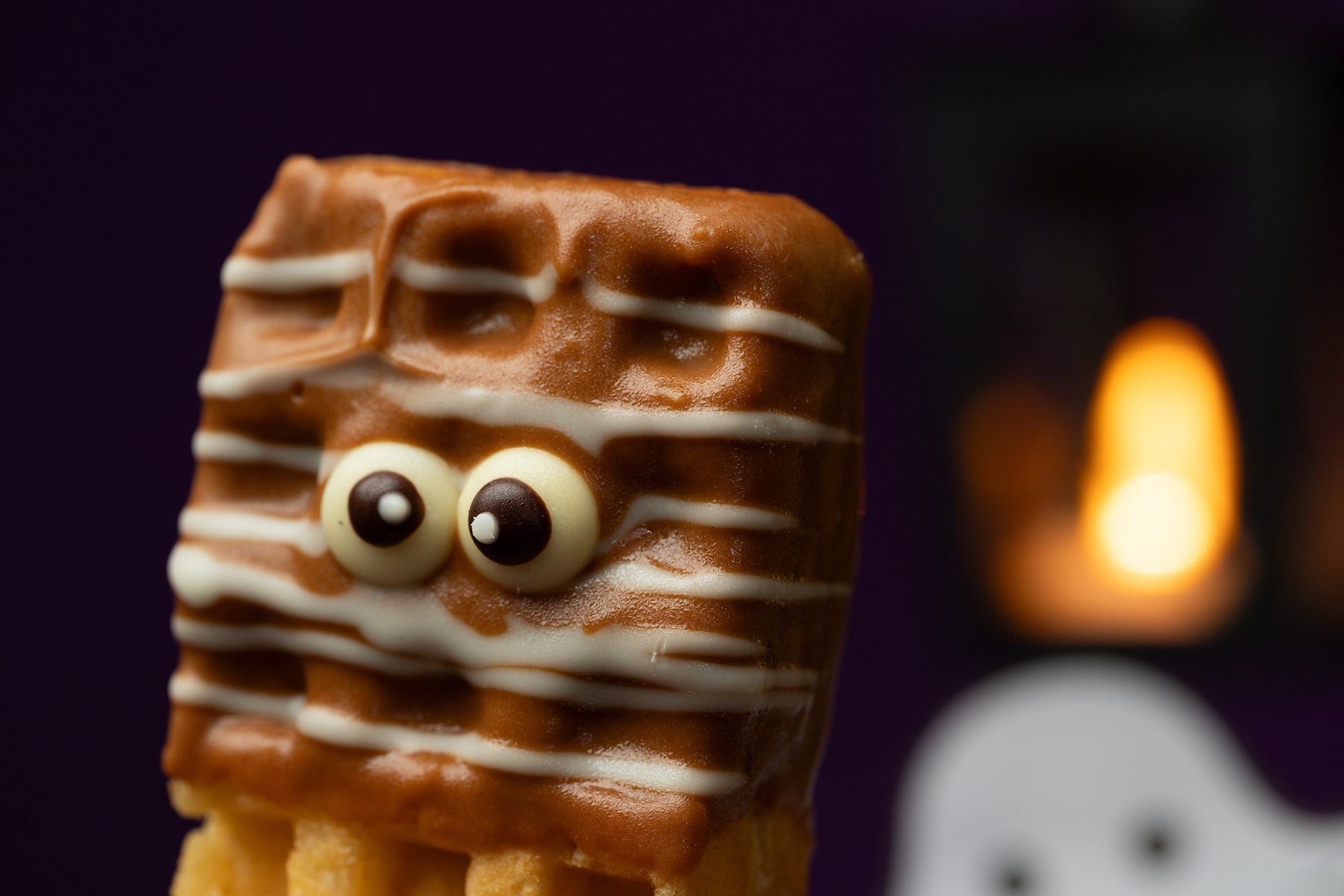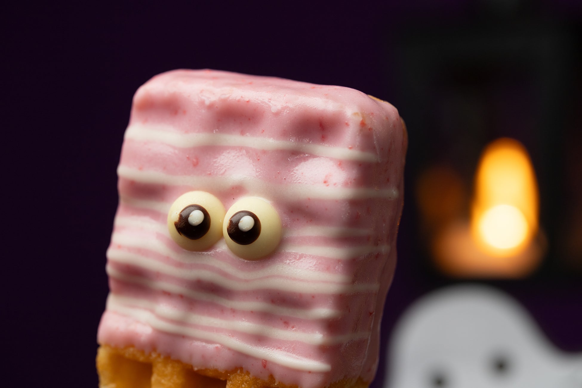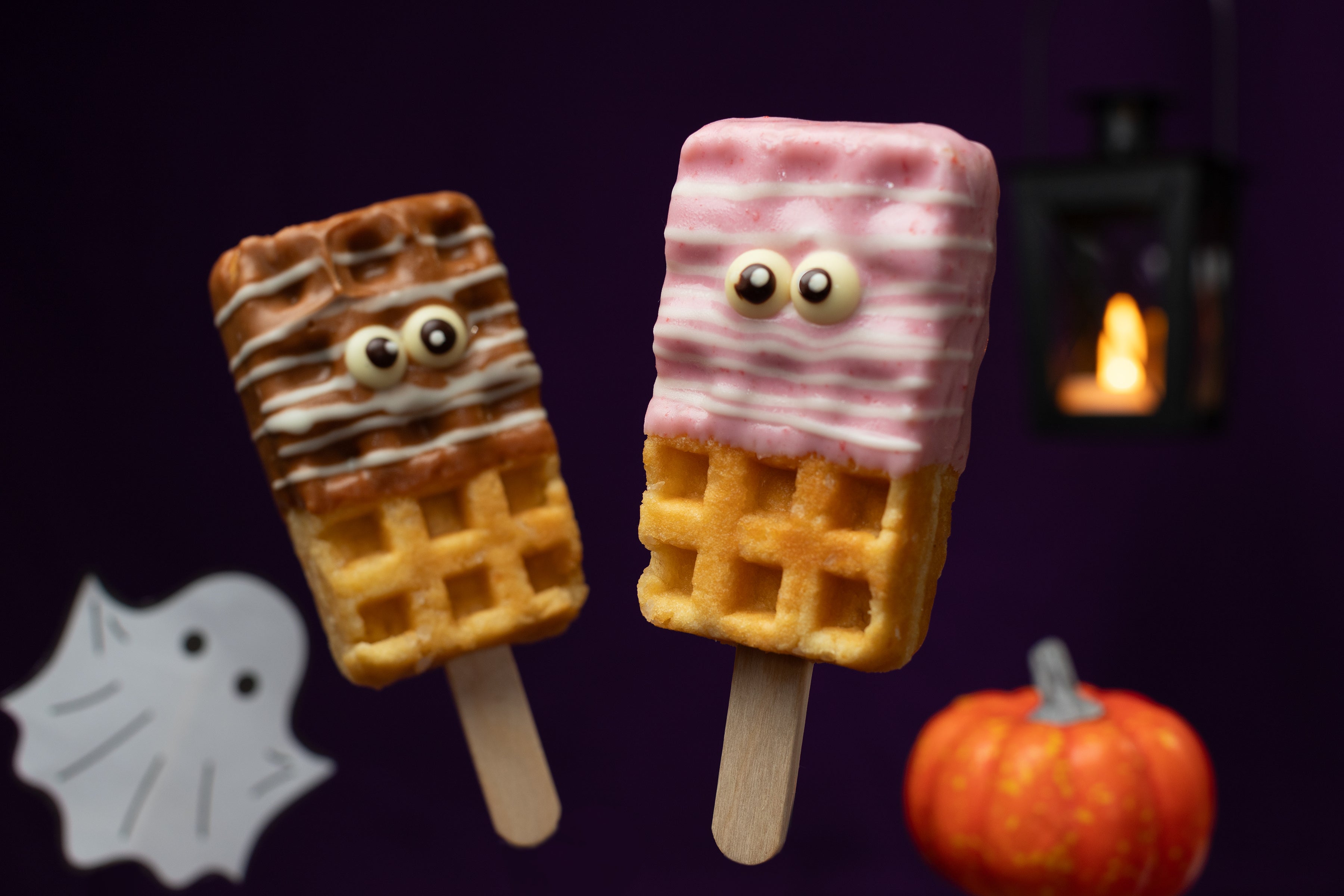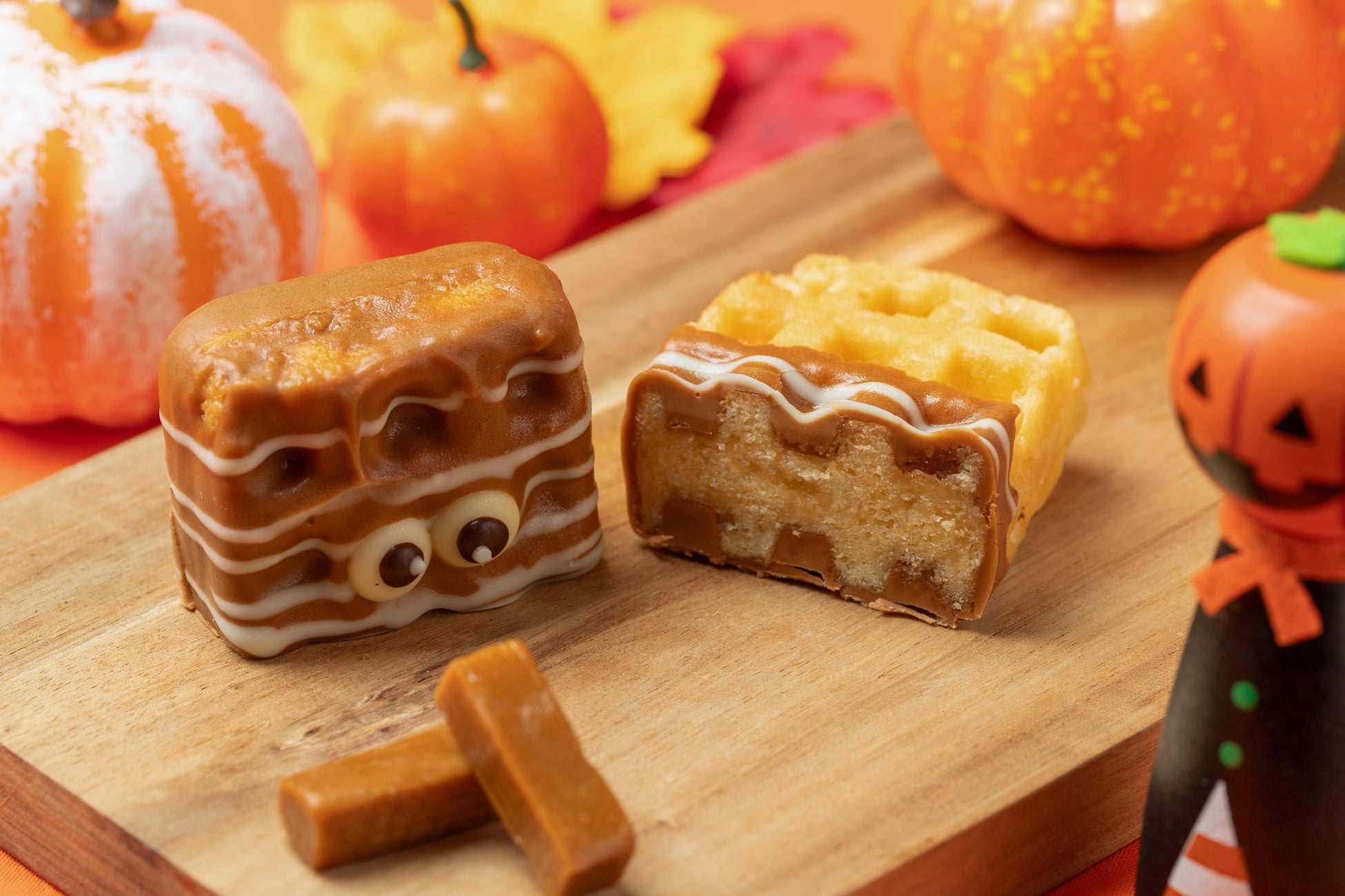 【おばけワッフル】片手で楽しむワッフルバーが、ハロウィン仕様に変身!ぎょろ目が可愛い"フランケンシュタイン"や"ミイラ"モチーフの期間限定ワッフルBOXが登場|10/11(水)〜販売開始