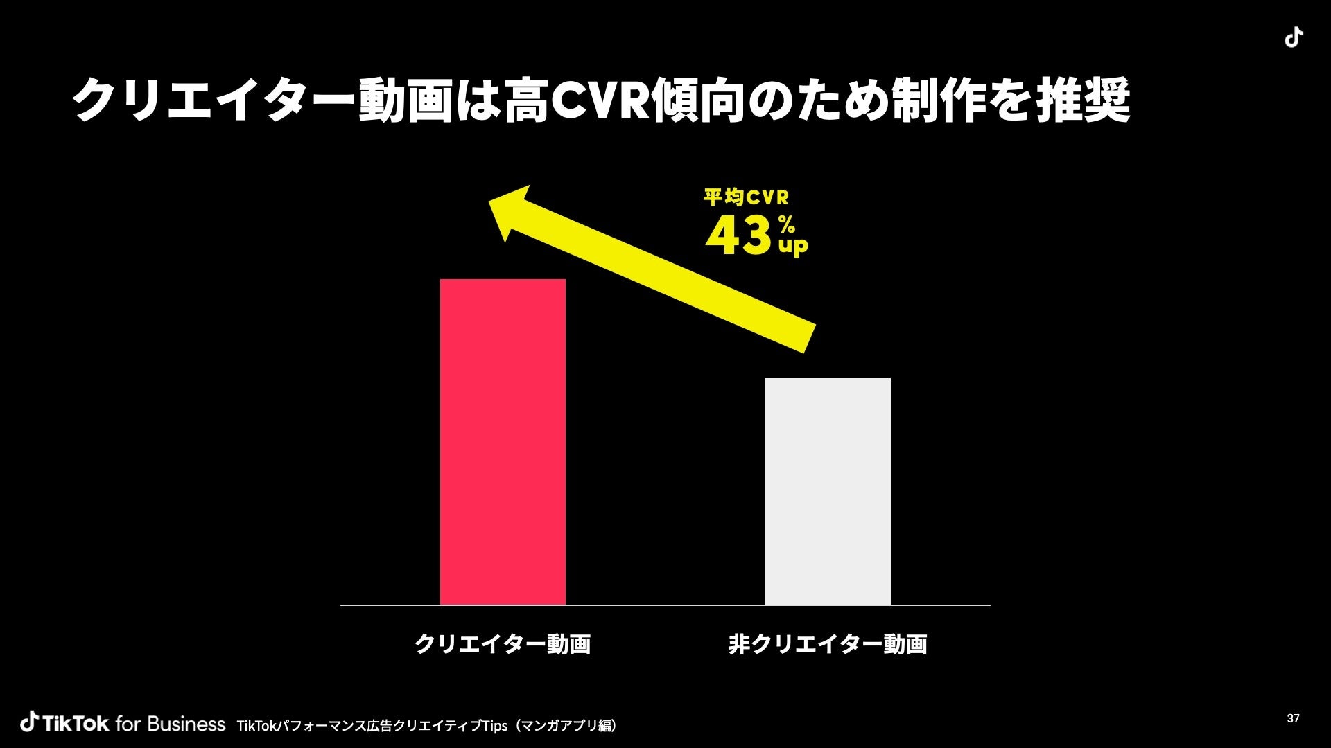 クリエイターを活用した動画は、活用しない動画よりもCVRが高い傾向にあり、平均CVRが43%高くなっています。