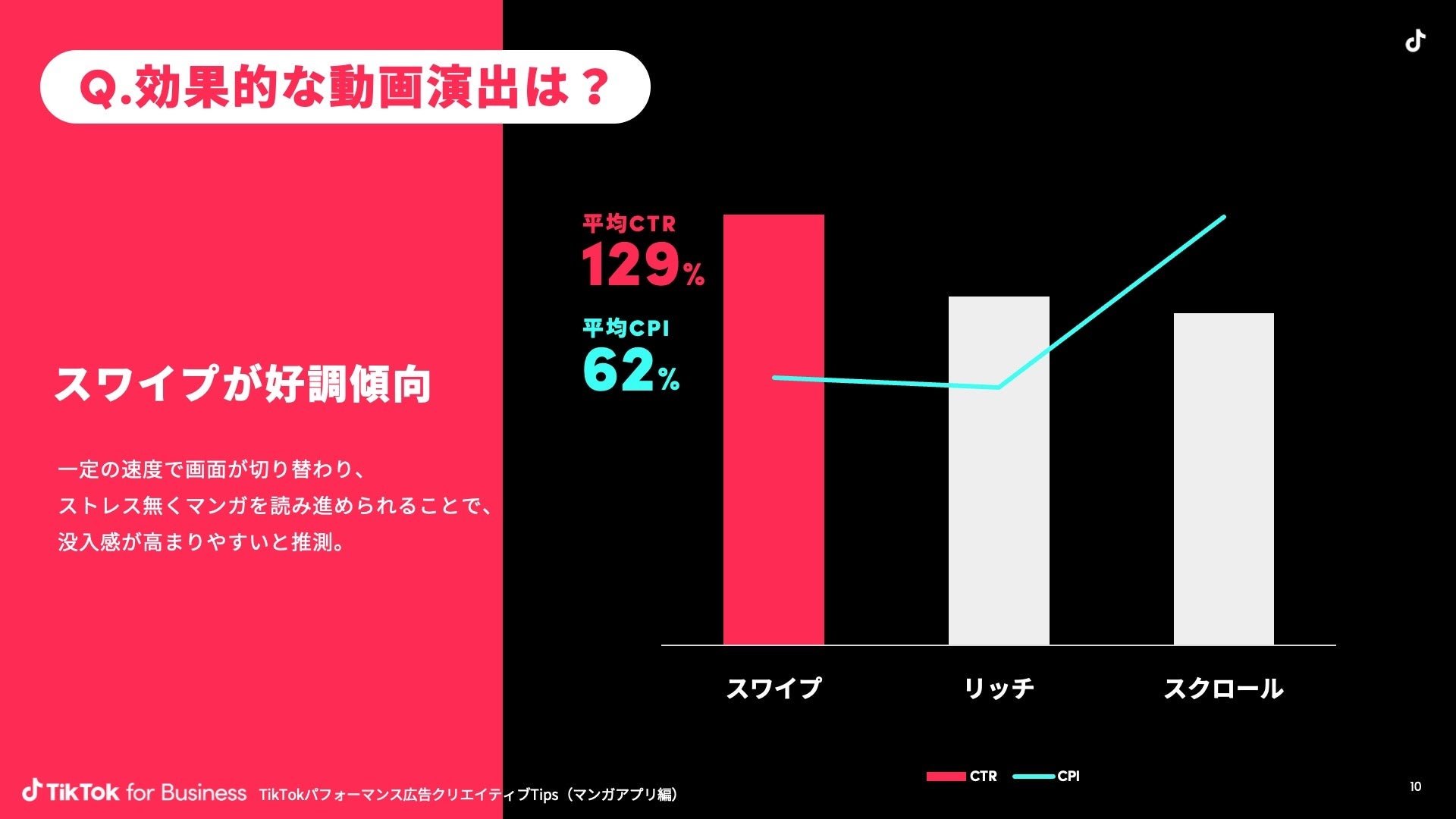 マンガアプリの広告の場合、「スワイプ」の平均CTRが129%と最も高く、平均CPIも62%に留まっていることから、より効果が高い演出であると言えます。