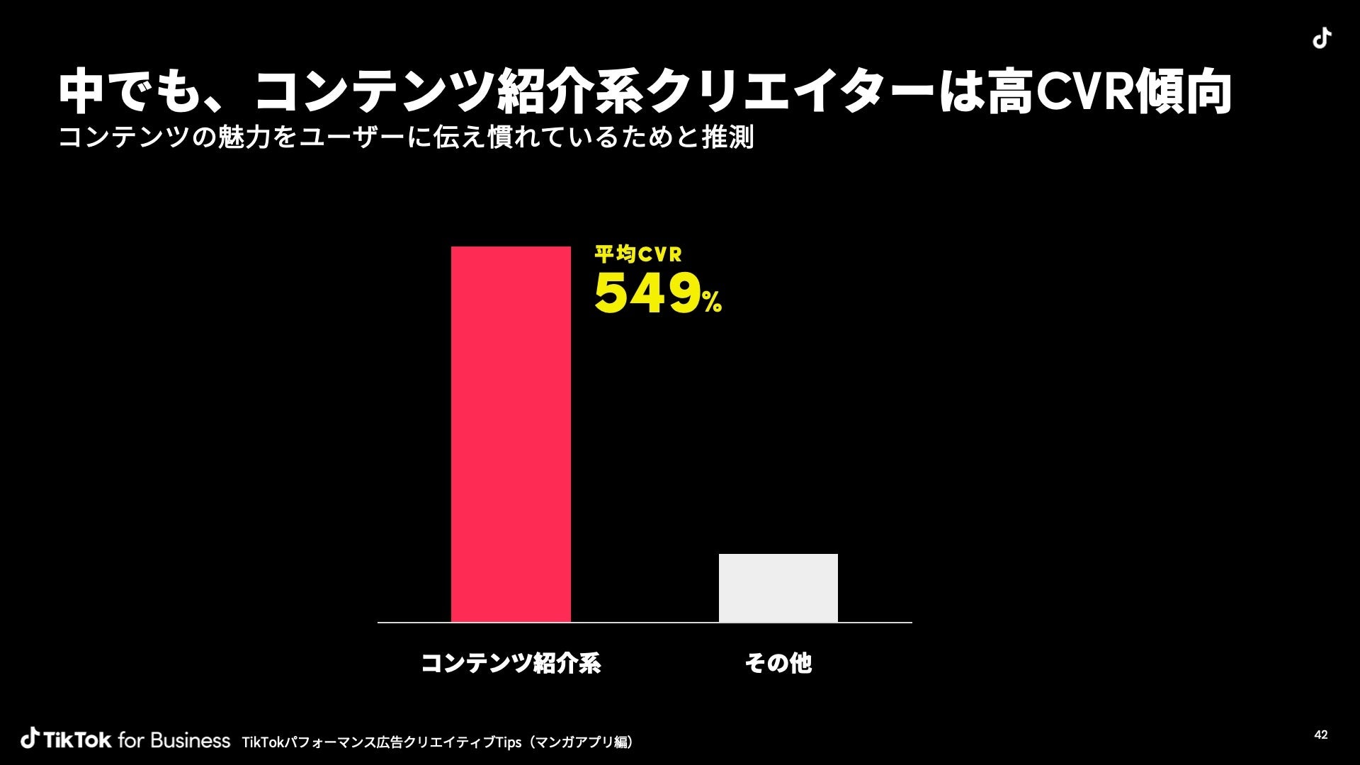 さらに、クリエイターの中でも「コンテンツ紹介系クリエイター」は、その他のクリエイターよりも効果が高く、平均CVRが549%となっています。おすすめの映画、マンガ、小説などをオーガニックで投稿している「コンテンツ紹介系クリエイター」が高CVR傾向にあるのは、コンテンツの魅力をユーザーに伝えることに慣れているためと推測されます。