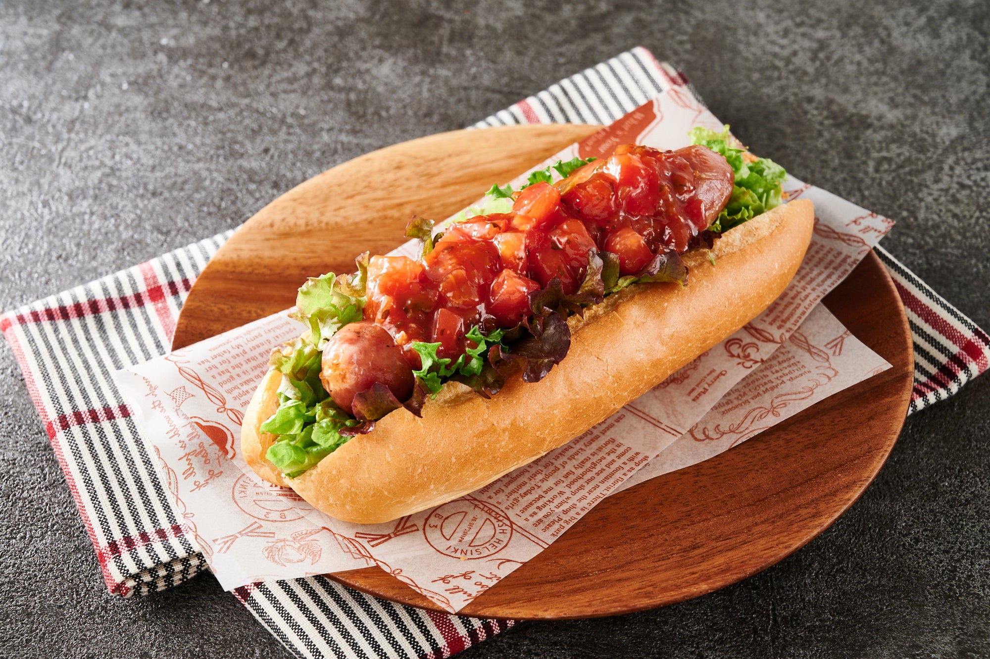ウソップの鼻をイメージさせるジューシーなロングソーセージに必殺〝火薬星〟が登場!ホットなサルサソースとハードドックの相性がバッチリ!