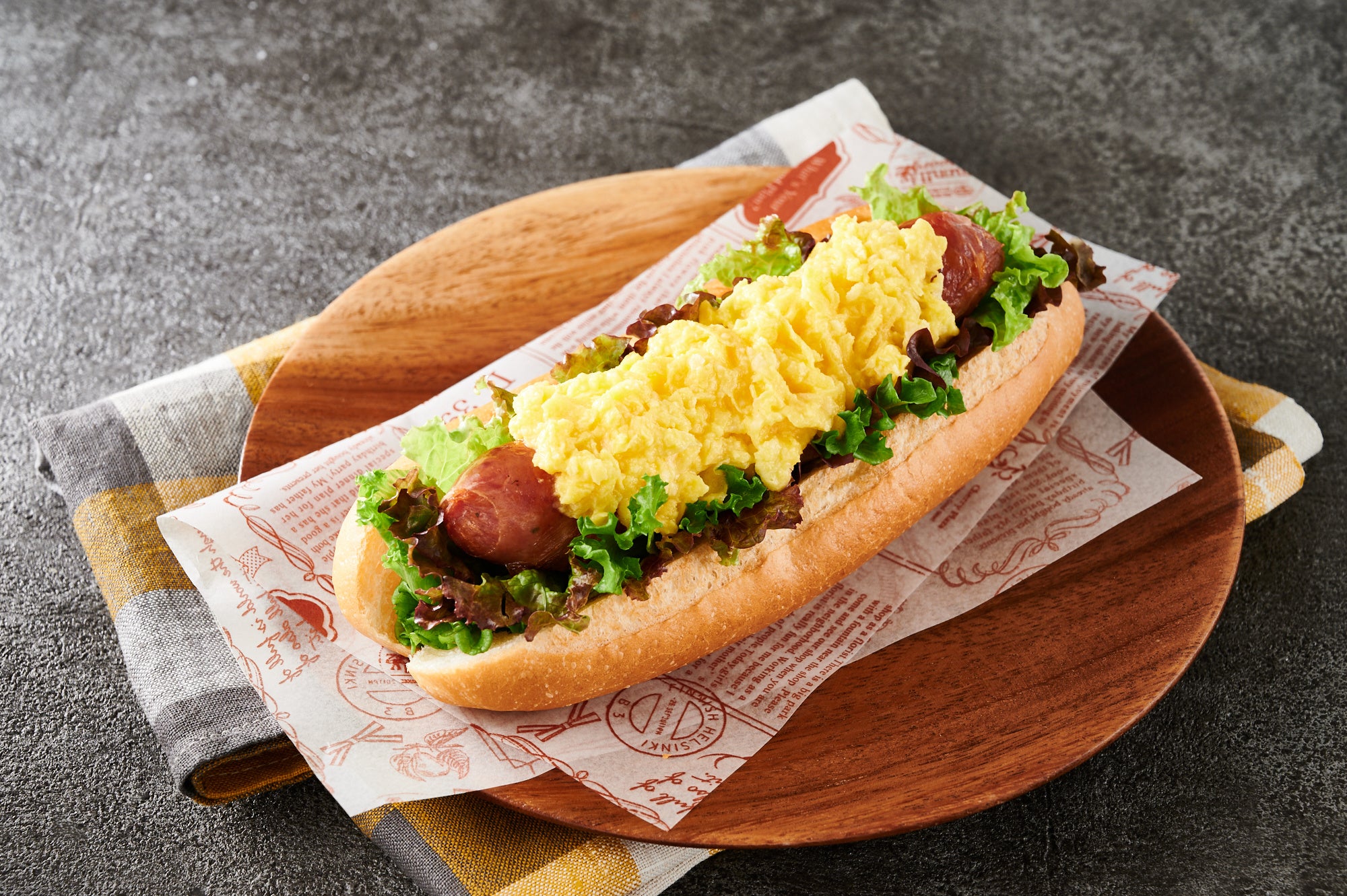 ウソップの鼻をイメージさせるジューシーなロングソーセージに必殺〝新鮮卵星〟が登場!まさに新鮮卵のスクランブルエッグをのせてみました!マイルド&ボリューミー!