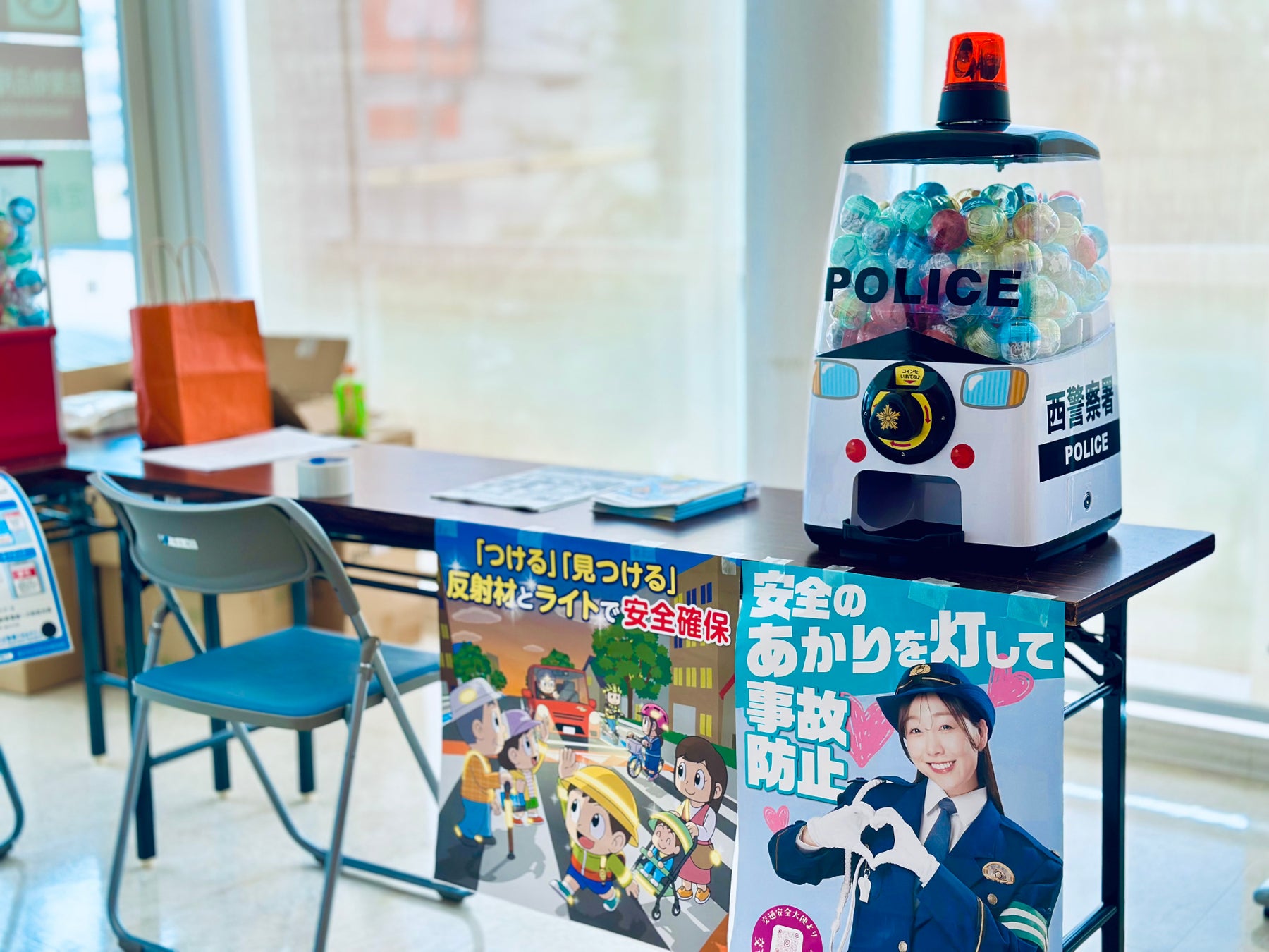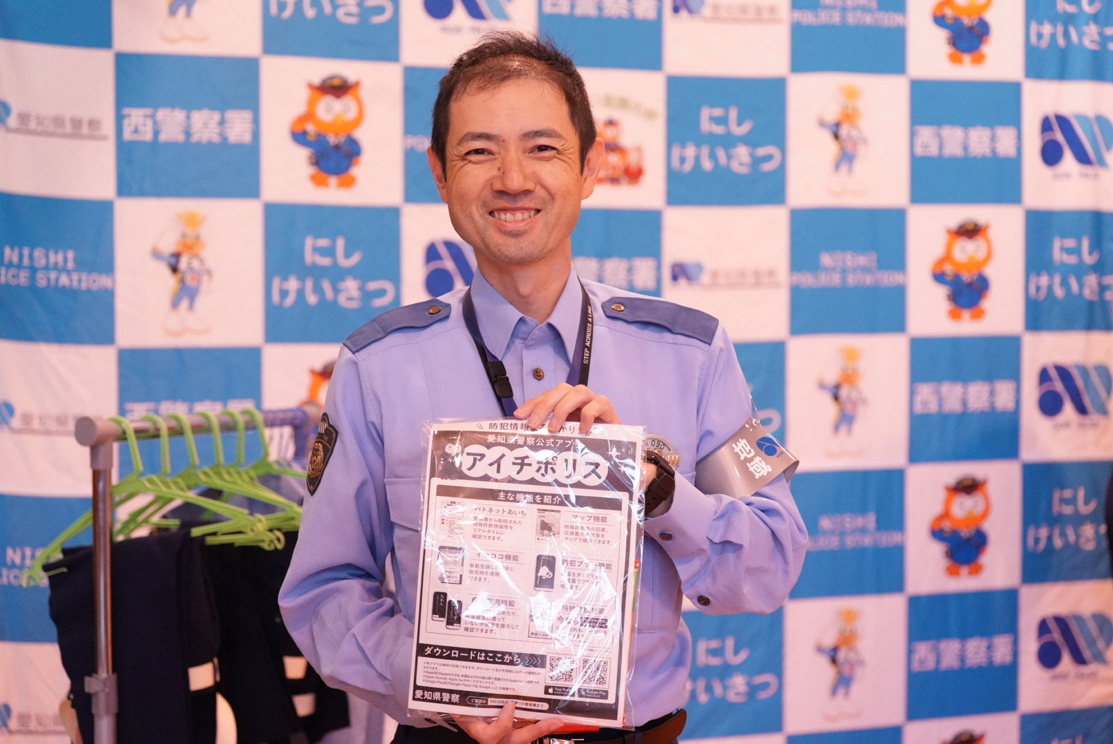 「新聞で西区の企業が力を合わせて活動している『客相Meetup』の記事を読み、ぜひ何かでご一緒したいと思い春日井製菓さんに連絡しました。会場では警察官の制服を着られるフォトブースのほか、振り込め詐欺撲滅のための国際電話利用休止申し込みや、子どもの連れ去り防止のチラシ配布、警察アプリの紹介もできました。」