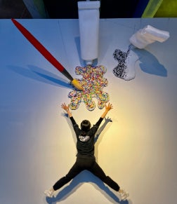 「筆と絵の具」の大きなオブジェを館内に設置しました。巨人と小人(巨大な道具と小さな被写体)の不思議で面白い写真撮影が体験できます。今後もオブジェを増やす予定です。お楽しみに。