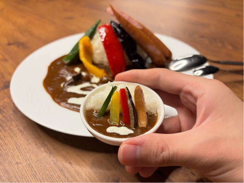 本物と同じ材料で作ったミニサイズの「ミニミニカレー」をご提供します。本物のカレーライスとセットでもご注文できます(割引料金)。面白い写真撮影とお食事が同時に体験できます(2025年8月30日までご提供予定)