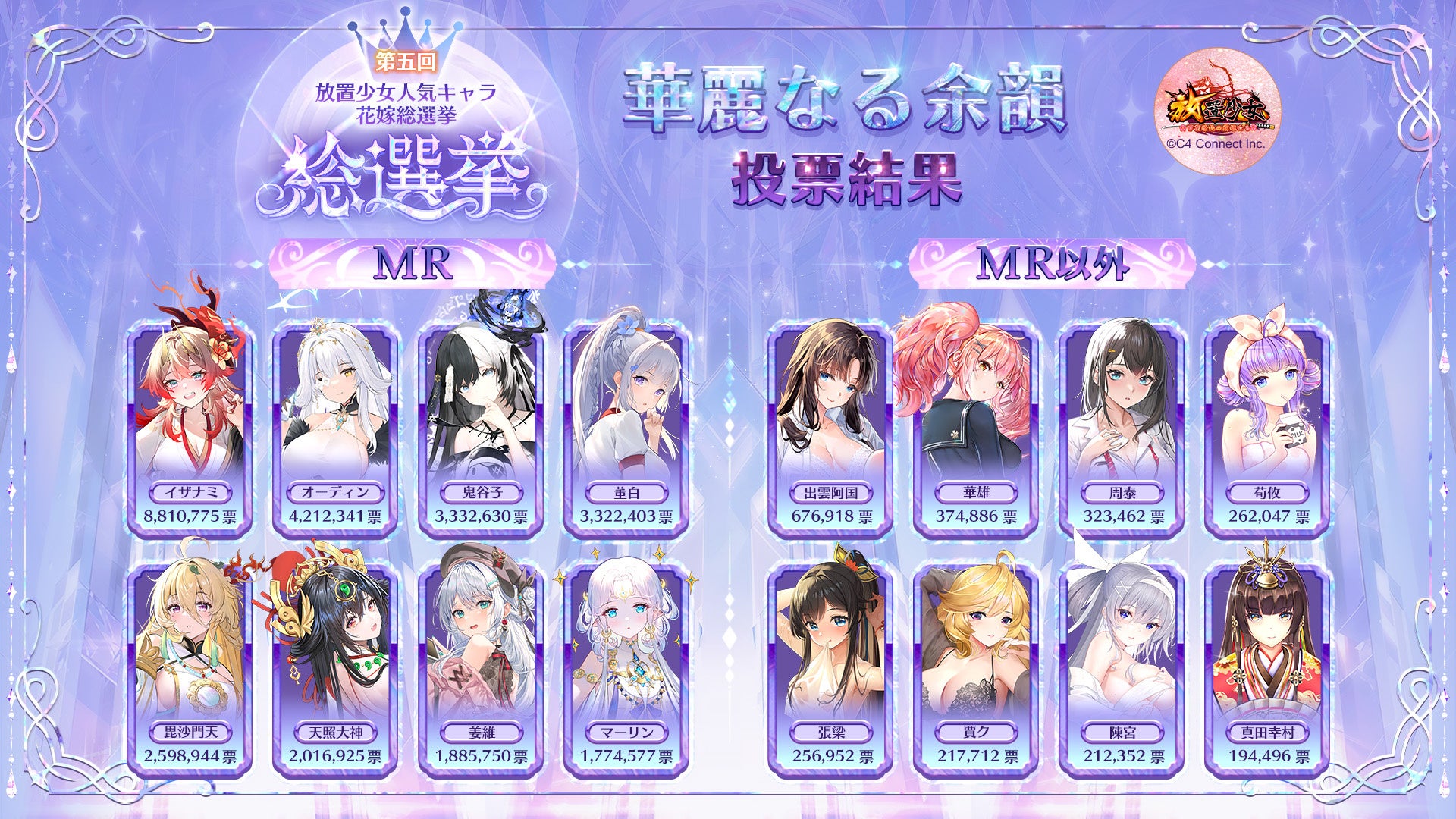 C4 Connect株式会社(本社:東京都渋谷区)は、現在サービス中の美少女RPGゲーム『放置少女〜百花繚乱の萌姫たち~』(スマートフォンアプリ及びブラウザ版)(以下、『放置少女』)にて開催中の「第五回放置少女人気キャラ総選挙」の段階①『華麗なる余韻』の投票結果を発表いたします。