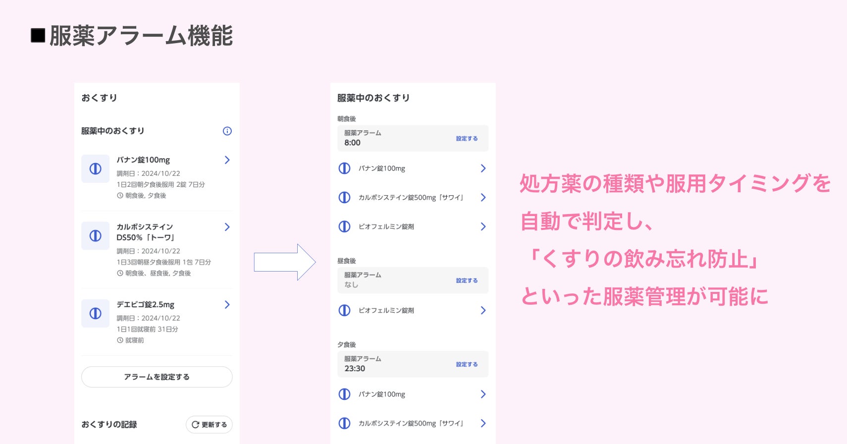 今回の機能改善では、1回のマイナンバーカード認証で最大90日間、調剤情報などが自動取得され「ユビー」上に反映されるようになります。これにより手元のスマートフォンで常に最新の受診と調剤の記録を把握できるようになります。さらに今春には、自動更新された処方データを活用した「服薬アラーム機能」をリリース予定です。処方薬の種類や服用タイミングを自動で判定し、くすりの飲み忘れ防止といった服薬管理が可能となります。
