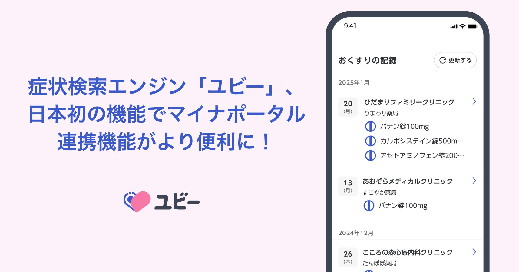 症状検索エンジン「ユビー」、日本初の機能でマイナポータル連携機能がより便利に!スマホで受診や調剤の最新記録をいつでもチェック