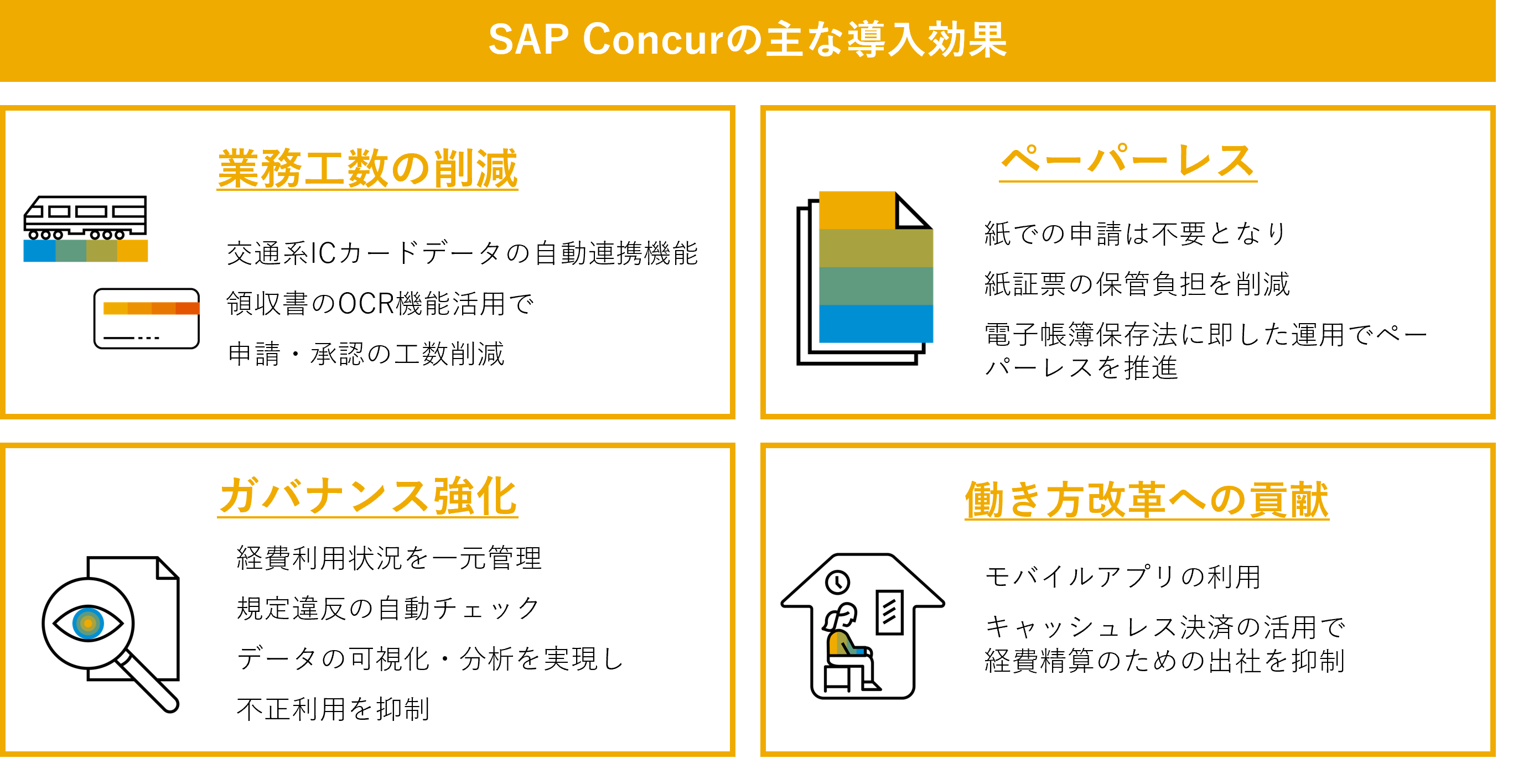 SAP Concurの導入により、煩雑になっていた申請プロセスがシンプルになり、紙証票の保管が不要、インボイス制度、改正電子帳簿保存法への対応が可能になります。また、SAP Concurのキャッシュレスサービス連携機能、交通系ICカード自動連携機能、規定違チェック自動化機能等を活用することにより、承認レスを推進します。利用開始後はコンカーがデータを分析、生産性向上・コスト削減といった指標に基づいた助言・改善支援をし、継続的に業務改革をサポートします。