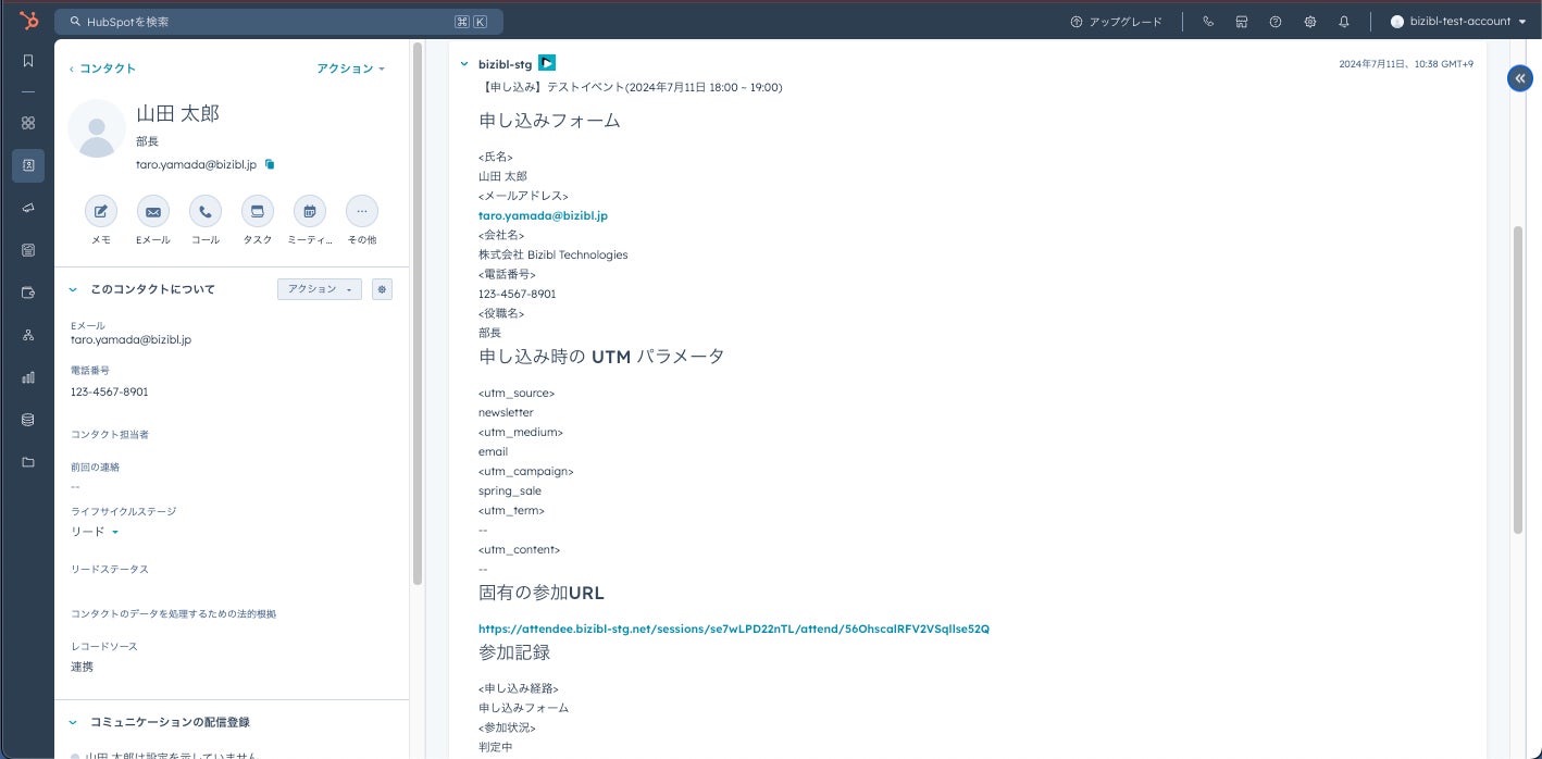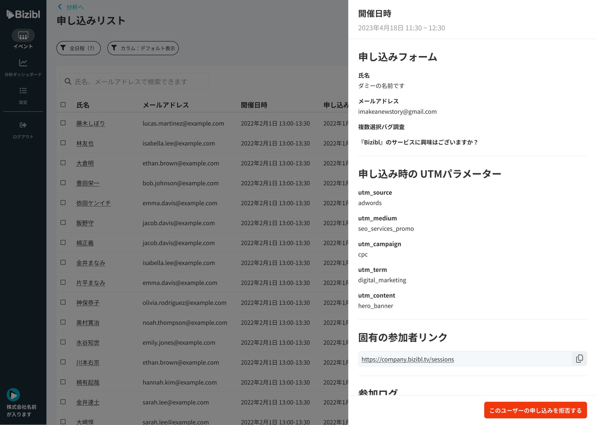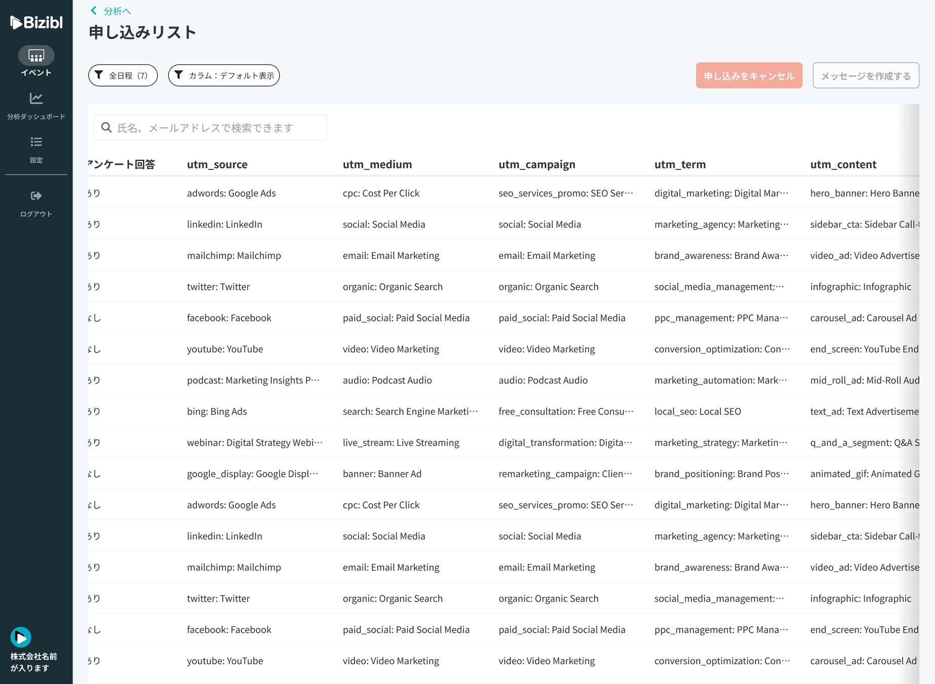 UTMパラメータを付与したURL上でイベント申し込みが行われた場合、「Bizibl」では以下に反映されます