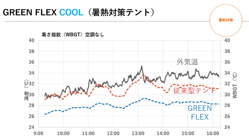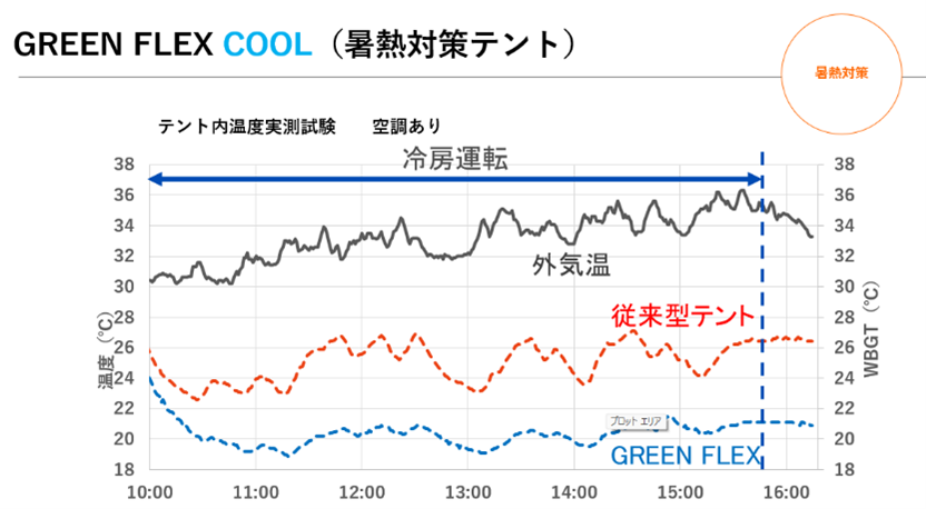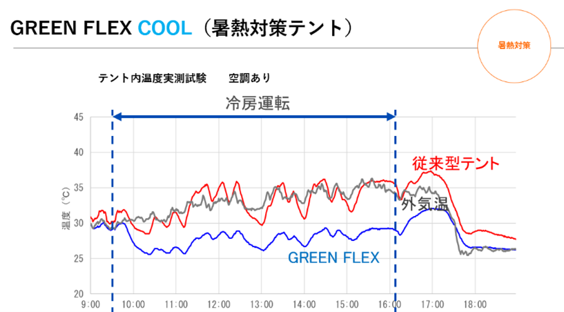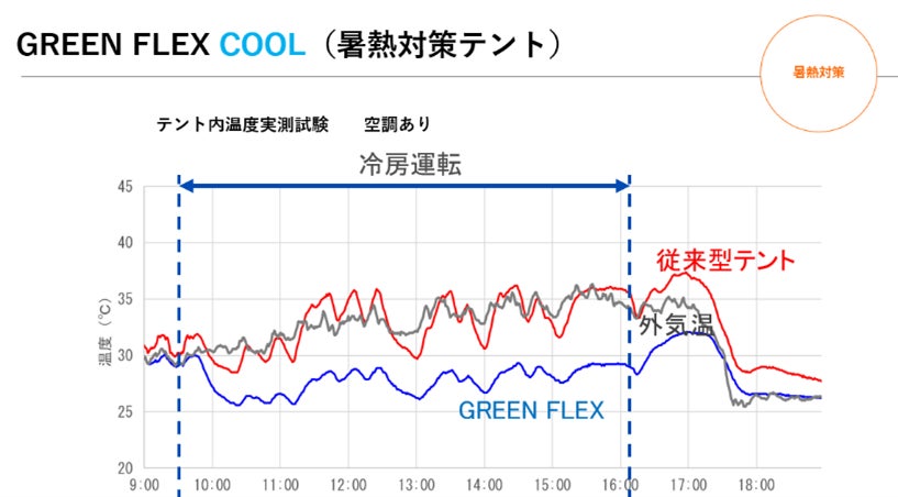 「GREEN FLEX」は幅6mで医療拠点としても機能する大型テントです。奥行きは2m単位でフレキシブルに伸ばしていくことができます。SPACECOOL社が開発した放射冷却性能を持つ光学フィルムを使用した新しい膜材「REI KEEP」(カンボウプラス株式会社製)を使用することで、外気の影響を受けにくい室内環境を実現。高温環境下でもテント内の温度上昇を抑え、避難生活や医療活動における快適性の向上に寄与します。さらに、用途や気候に応じて保温性能の高い膜材に交換することで、寒冷地にも対応可能です。将来的には、膜屋根への搭載を想定した太陽光発電モジュールの活用により、外部電源に依存しない冷却装置の稼働も視野に入れています。なお、検証段階として太陽光発電モジュールをテント上に設置 する実証試験を実施しており、今後は膜材と一体化した形での実装に向けた技術開発を進めていきます。避難生活における快適性や安心感の向上など、“ウェルビーイング”の観点からの環境改善にも寄与します。