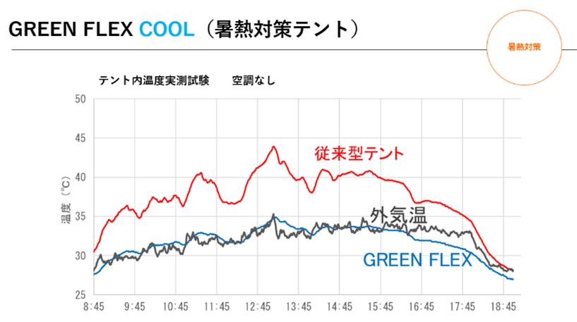 これにより、従来は熟練者を含む多人数を要していた大型 テントの設営を、「GREEN FLEX」は6名で約30分で行うことが可能となりました。