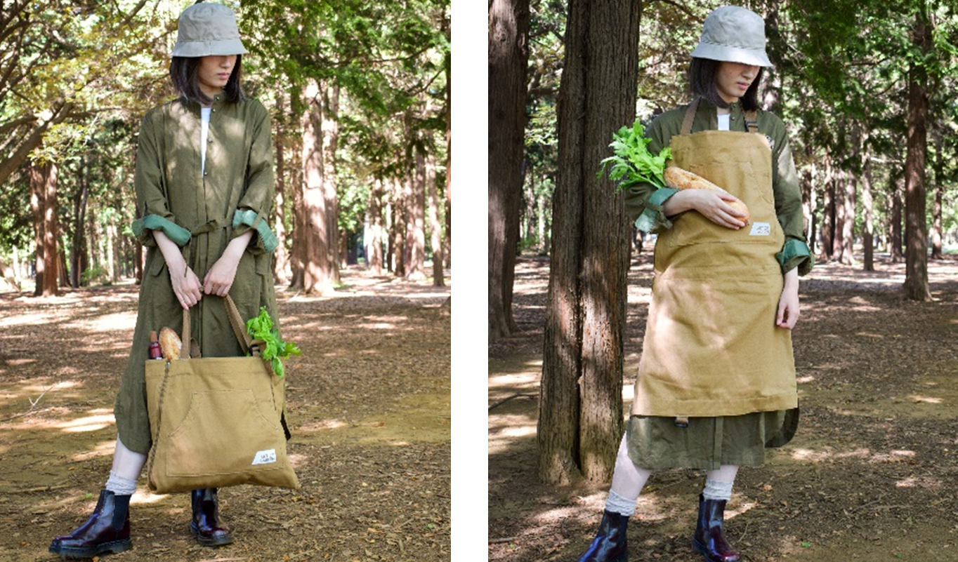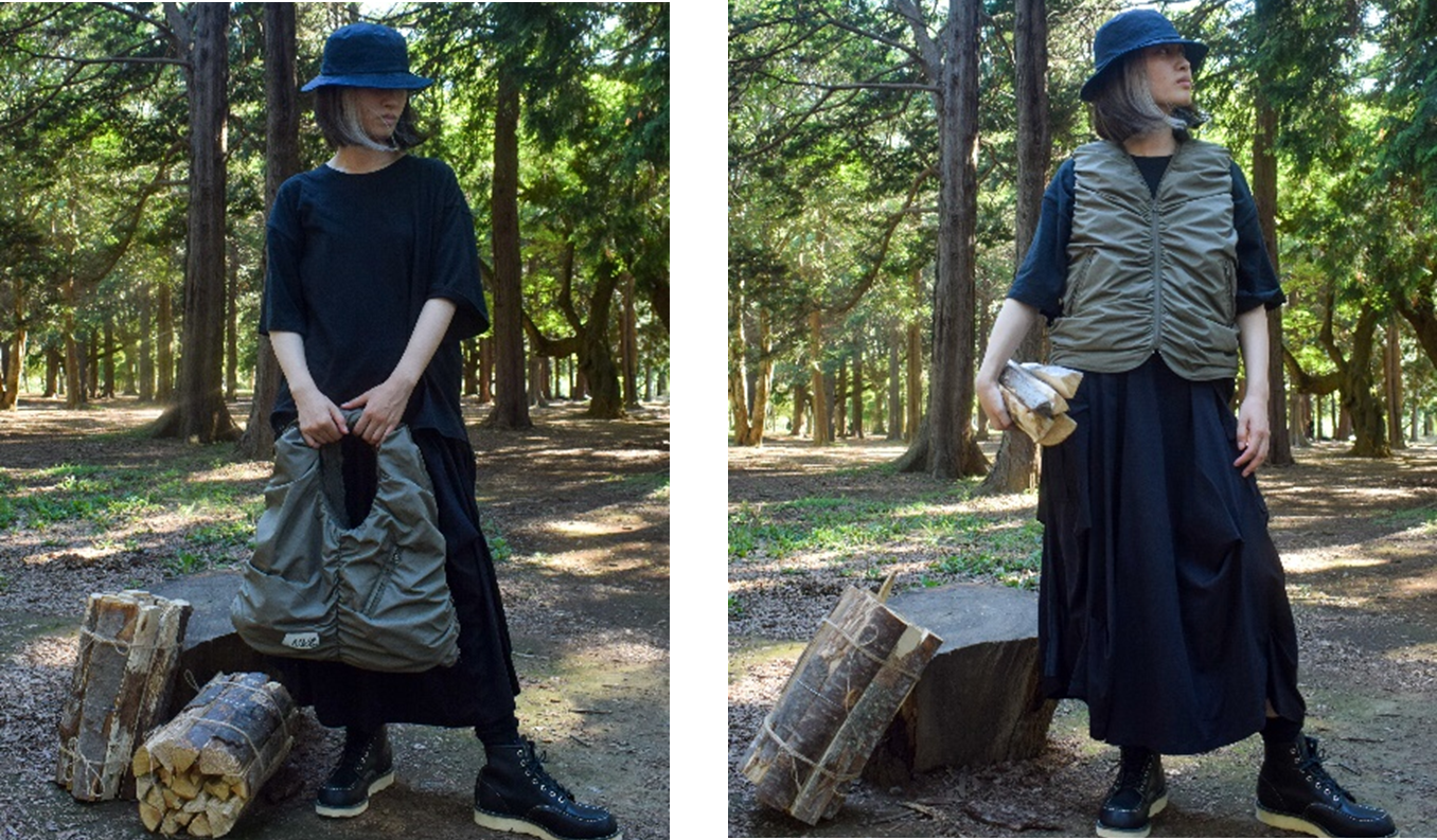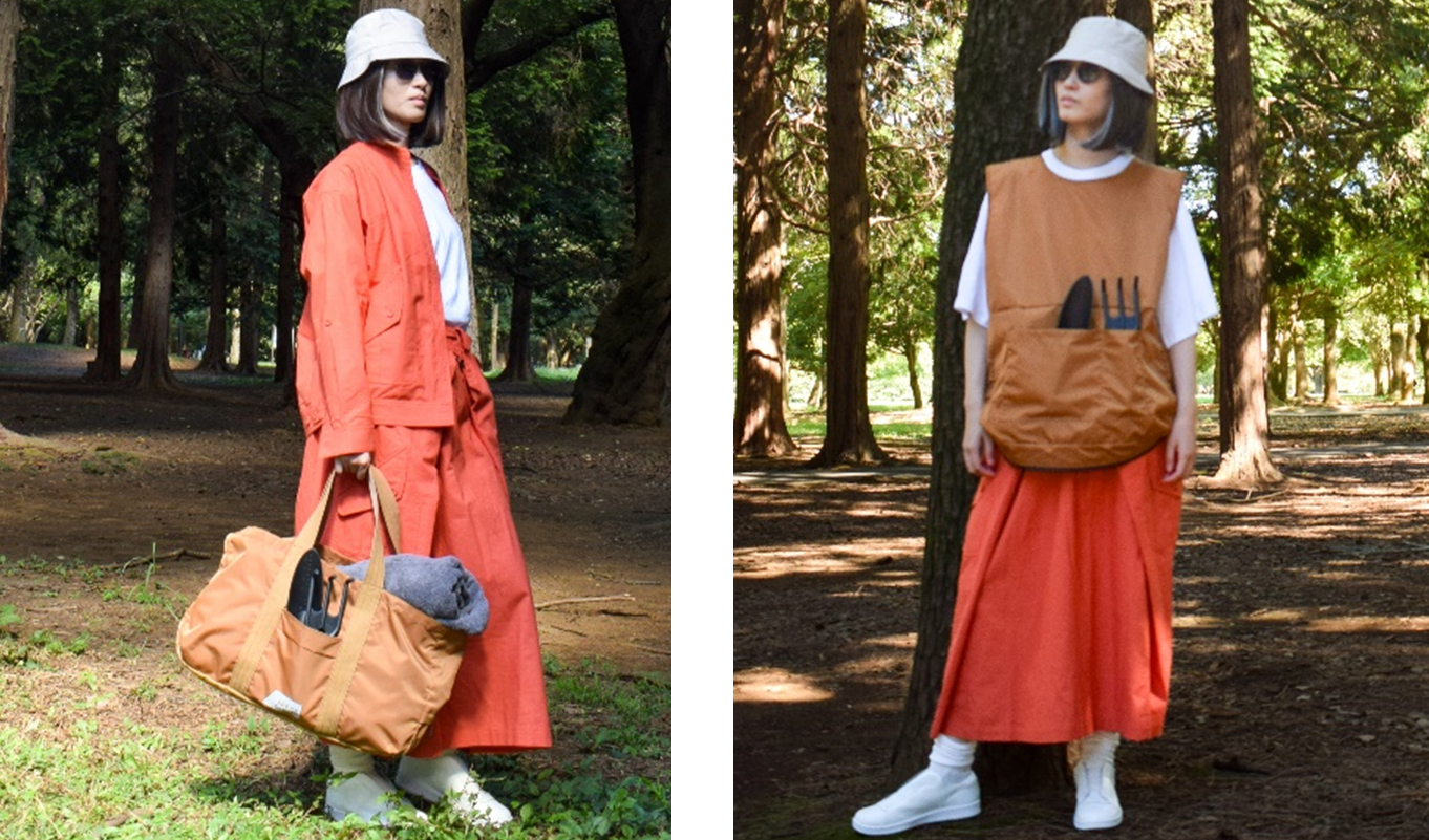 ウェアに変身させると、フロント部分がポケットになっていて、ガーデニングやアウトドアのシーンで着られるベストになります。