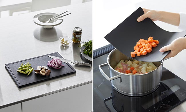 厚みのあるしっかりしたまな板と、それに載せて使えるシートまな板のセット。