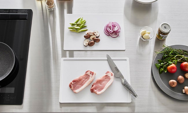 野菜の次に肉・魚をカットしたい時にシートまな板をサッと外すだけで使い分けができます。