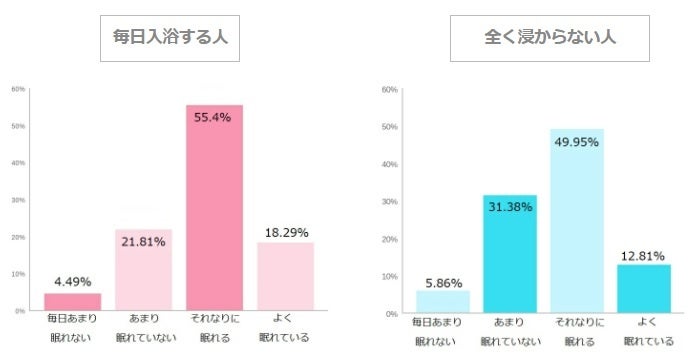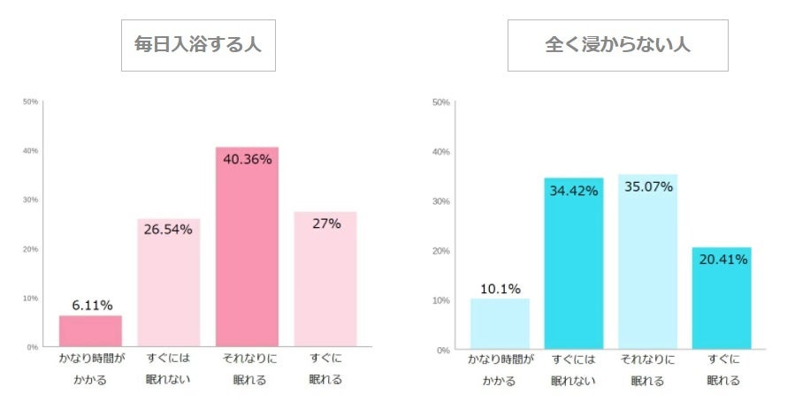 すぐに眠れるか、という質問に対して毎日浸かる人は、67.81%の人が眠れると回答、浸からない人は55.48%と、これも10%以上の差がでました。 実際に、お風呂に入って1~1.5時間後に布団に入ることで、入浴によって上げられた深部体温が徐々に下がっていき、その過程で自然に入眠することができます。