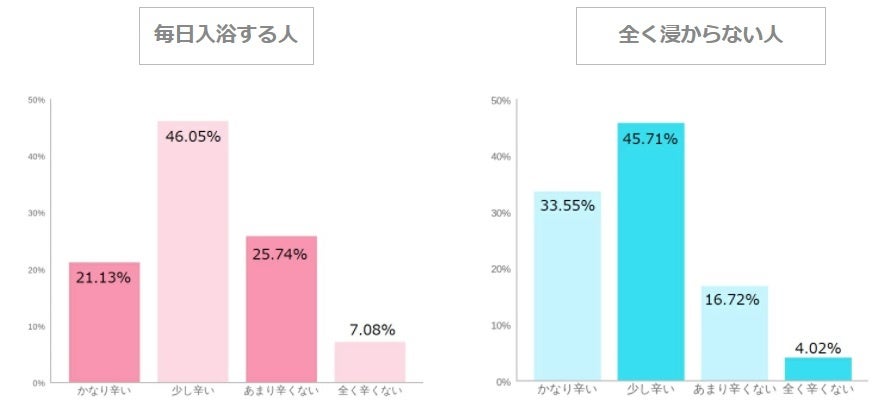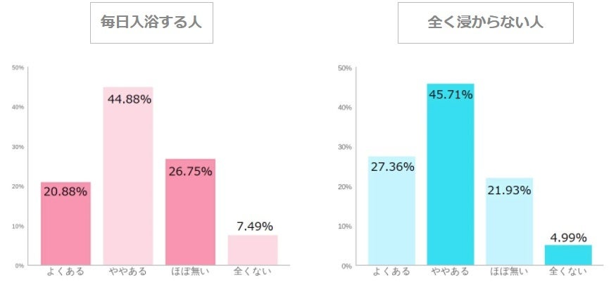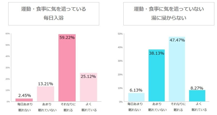ここまで、“よく眠れるか”“すぐに眠れるか”“朝つらいか”“日中の眠気”と、入眠から睡眠の質・日中の状態までを細かくみてきましたが、日~土毎日湯舟に浸かっている人のほうが、全く浸からない人よりも睡眠の質が良いということがわかりました。 眠りの質は単純に入浴するか否かだけではなく、湯の温度や入浴時間、入るタイミングにも拠ってくるため一概にはこの通りとは言えませんが、少なくとも、「入らない人よりは入る人のほうが眠りの質が良い」と言えそうです。