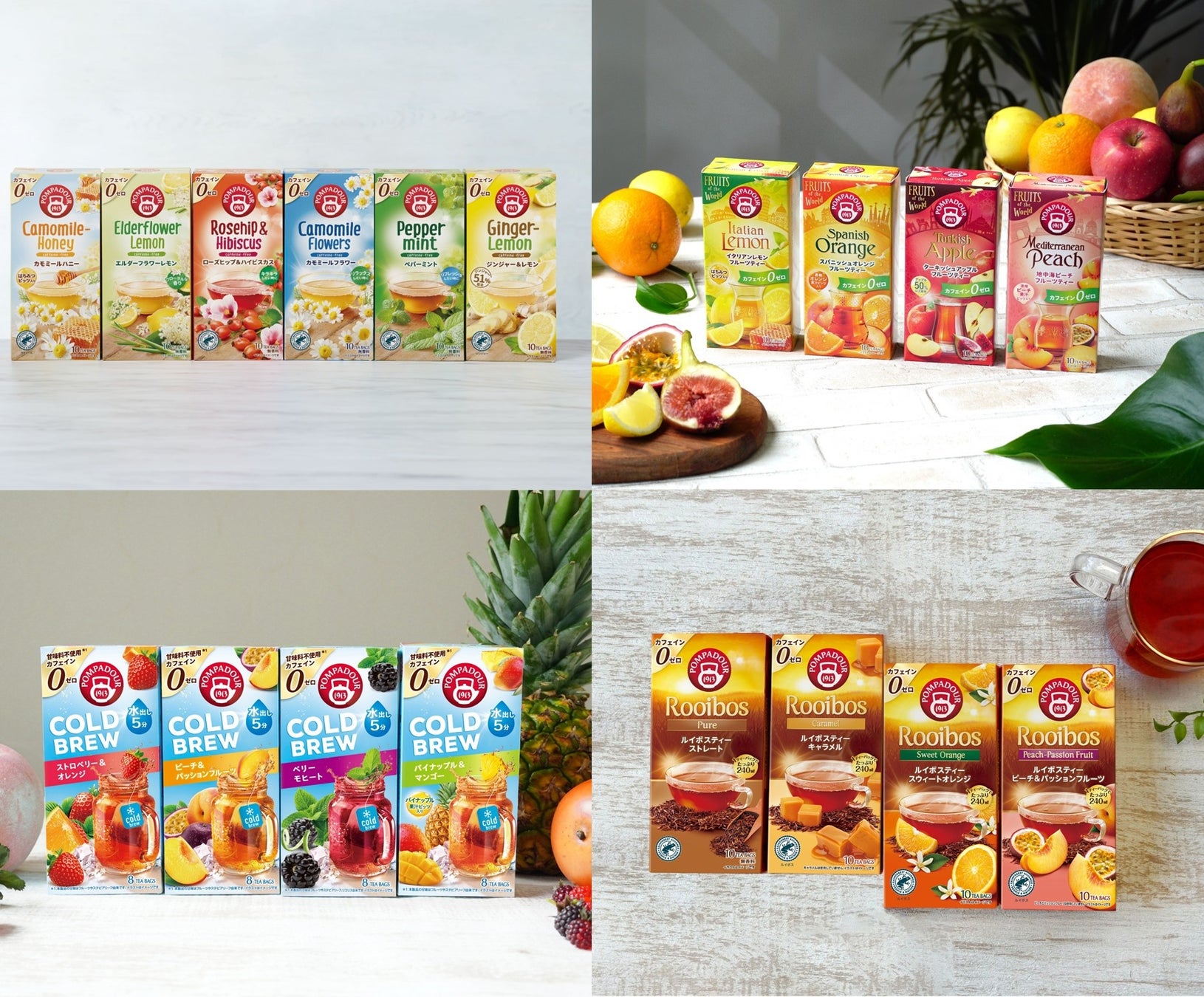 2025年現在、当社では本物のフルーツ※4 をたっぷりと使用したフルーツティー「フルーツ オブ ザ ワールド」や、自然な甘みとさわやかな飲み心地にこだわった水出し専用のフルーツティー「コールドブリュー」など、計20種類以上の「ポンパドール」商品を輸入・販売しております。