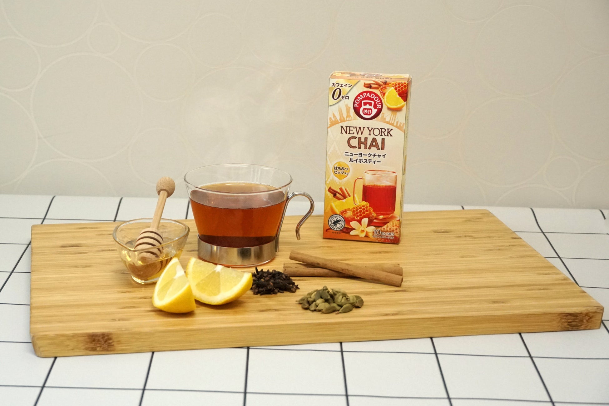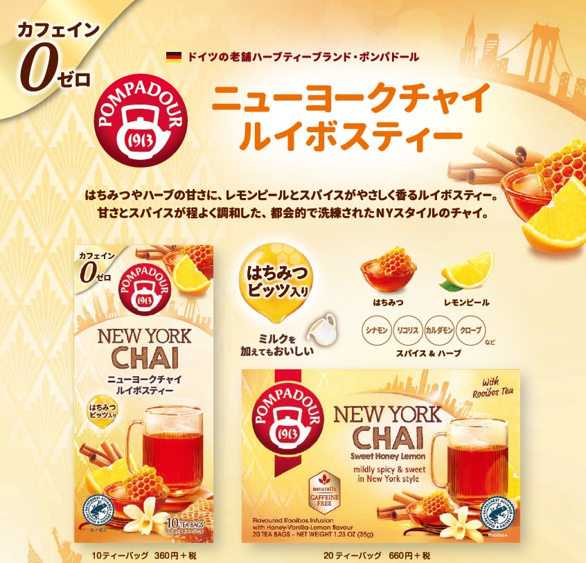 「ポンパドール ニューヨークチャイ ルイボスティー」は、はちみつやハーブの甘さ&スパイスがやさしく香る、ルイボスティーベースのノンカフェインチャイです。