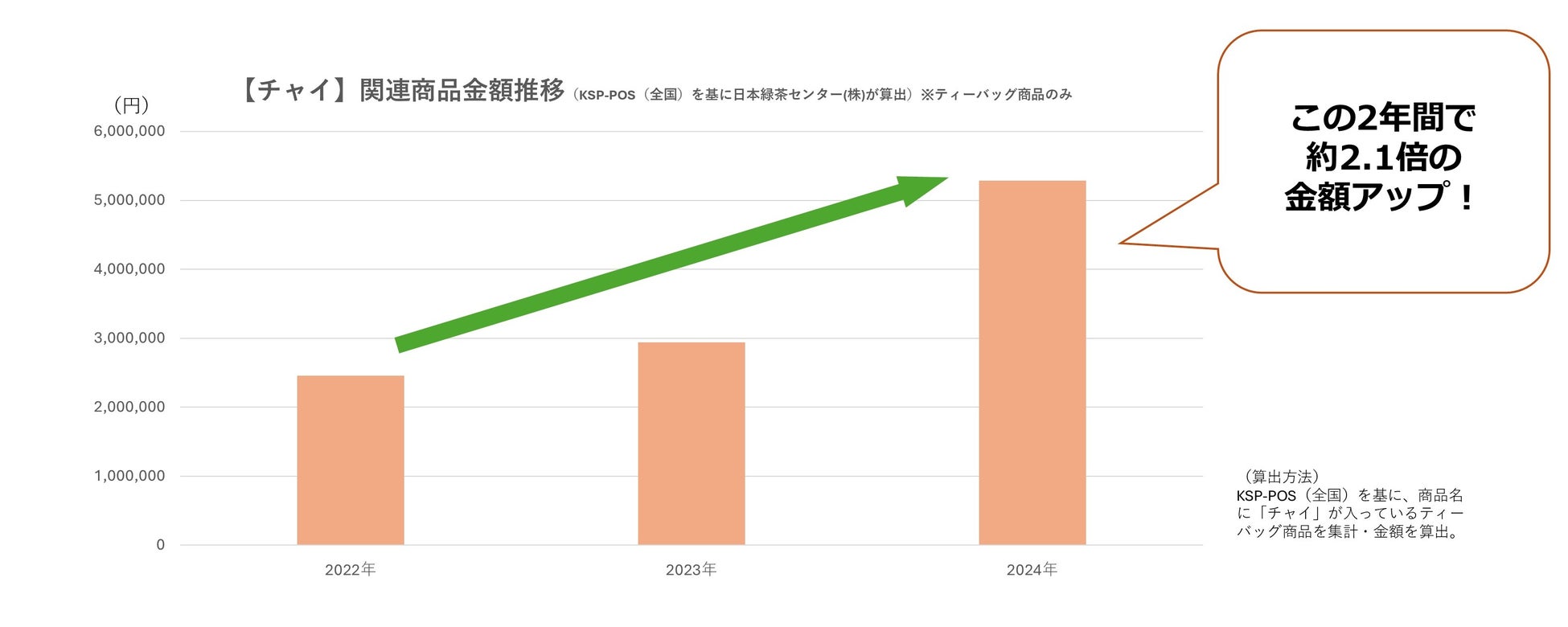 特にチャイ関連商品のティーバッグは金額が2022年~2024年の2年間で約2.1倍に伸長。スパイスが既に調合されているため、お湯を注げば手軽にチャイが楽しめる点が評価されていると考えられます。