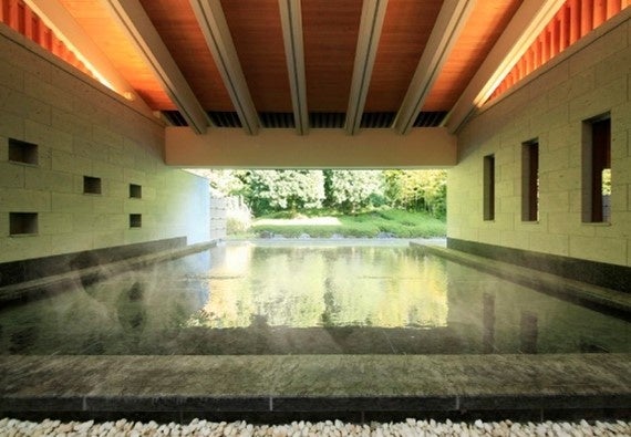 「赤沢迎賓館」の大浴場は、深緑が心地よい自然を目の前に、湯浴みをお愉しみいただくことができます。湯には、伊豆の水深800mから汲み上げた海洋深層水を用いております。ミネラル成分を豊富に含んでおり、やわらかな湯あたりと、肌をしっとり優しく包み込む心地よさをご体感いただけます。大浴場に備えたサウナと水風呂で、自然の風が心地よい空間と共に、身体の芯から解きほぐれる湯浴みをお愉しみください。