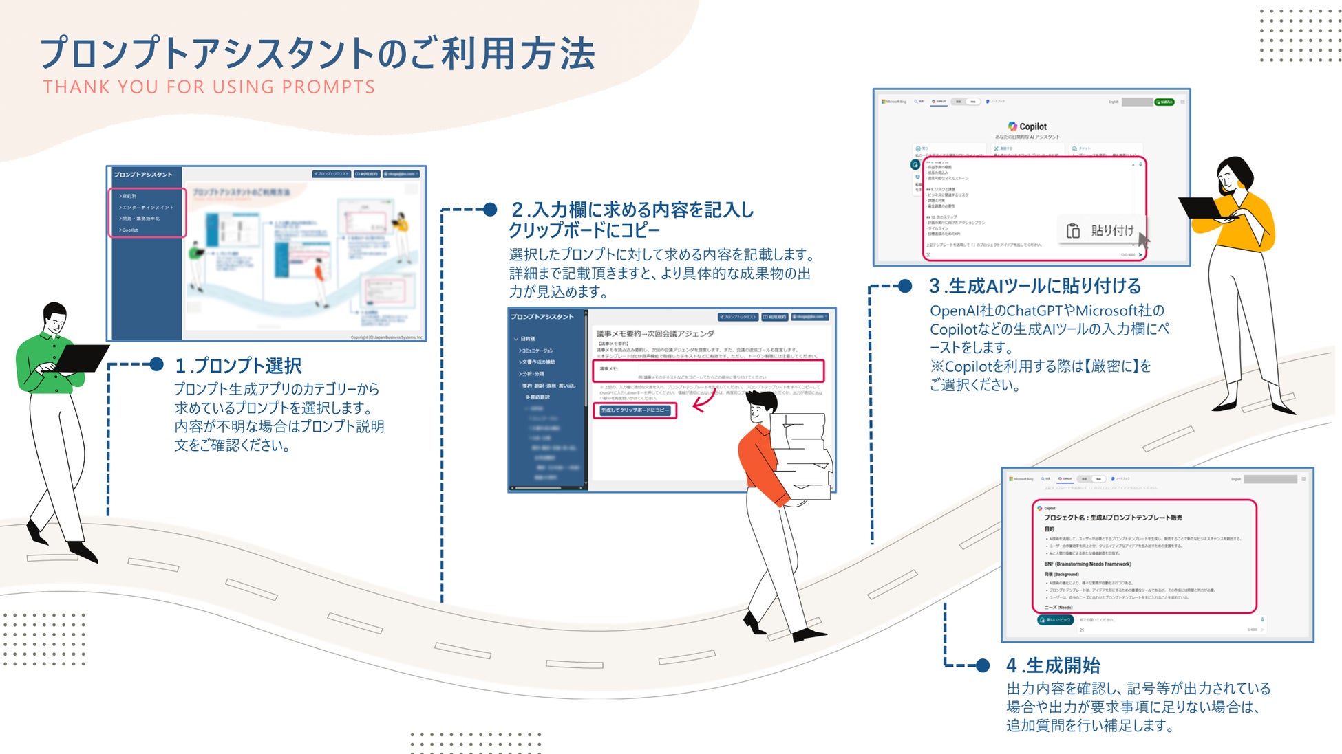 「生成 AI プロンプトアシスタント」の画面と基本的な使い方の流れ