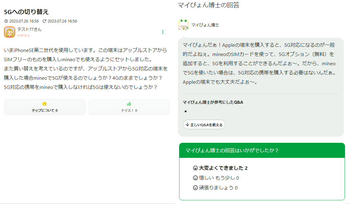 また、「マイぴょん博士」の回答に対する評価をマイネ王ユーザーからフィードバックいただくことで、回答精度を向上させていく仕組みとなっており、ファンとの共創を重視するmineoは、「マイぴょん博士」をユーザーのみなさまと一緒に育てながら品質・利便性を高めていきたいと考えております。