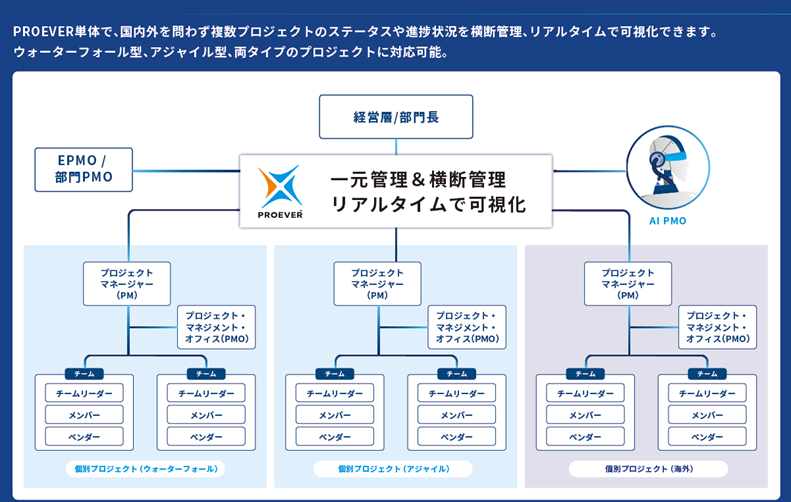 組織内に散在しがちな情報をリアルタイムで可視化・統合することで、複数プロジェクトを俯瞰的かつ横断的に把握でき、プロジェクトデータを“属人化した情報”から“組織の資産”へと転換します。