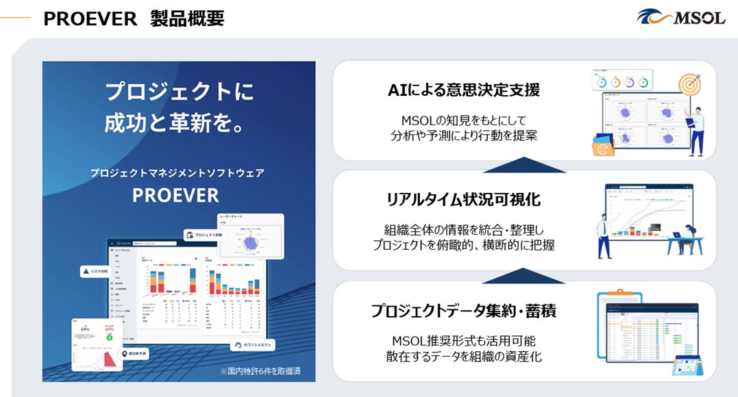 PROEVERは、プロジェクトマネジメント支援を専門とするMSOLの知見をもとに、プロジェクトデータを集約・蓄積し、AIによる分析・予測を通じて意思決定や次の行動を支援するプロジェクトマネジメントソフトウェアです。