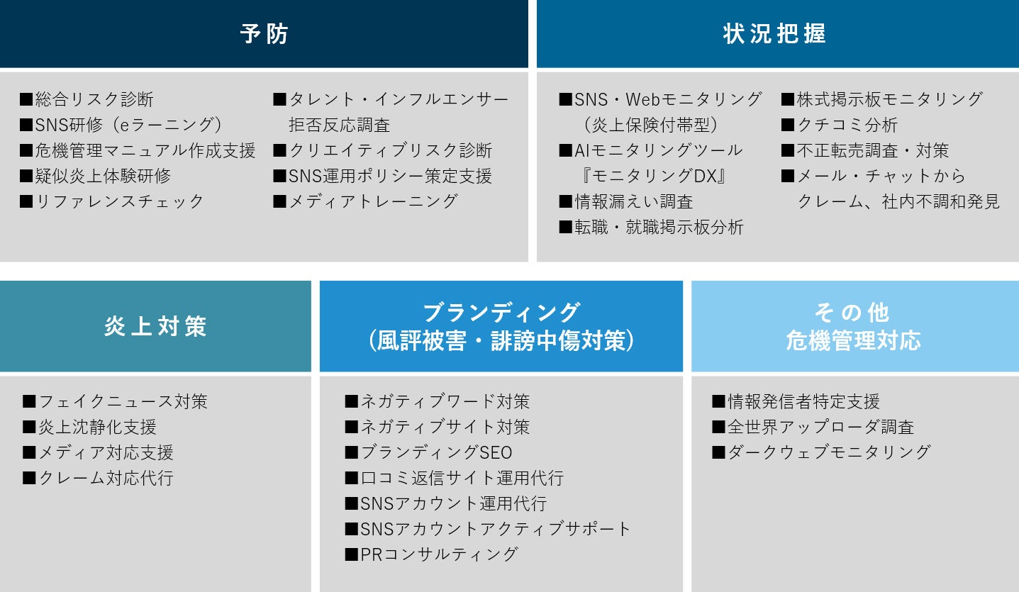 ネット炎上の予防から沈静化、評判管理、誹謗中傷対策まで、あらゆるニーズに合わせた幅広いソリューションを展開しており、予防・監視から対策まで一貫して行うことができるのが弊社の特徴です。