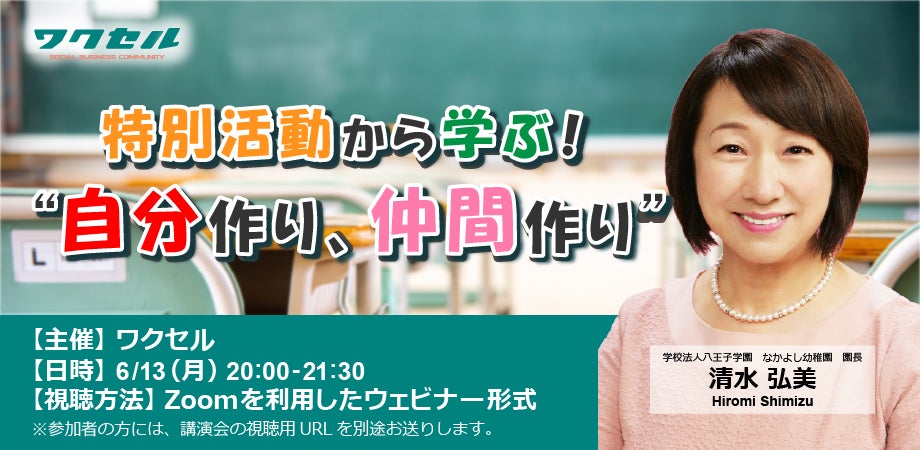 ソーシャルビジネスコミュニティ ワクセル(主催:嶋村吉洋)は、著書『子供の心を伸ばす特別活動のすべて』で有名な清水弘美(しみずひろみ)さんを講師に招いて、6月13日(月)にオンラインで講演会を開催しました。